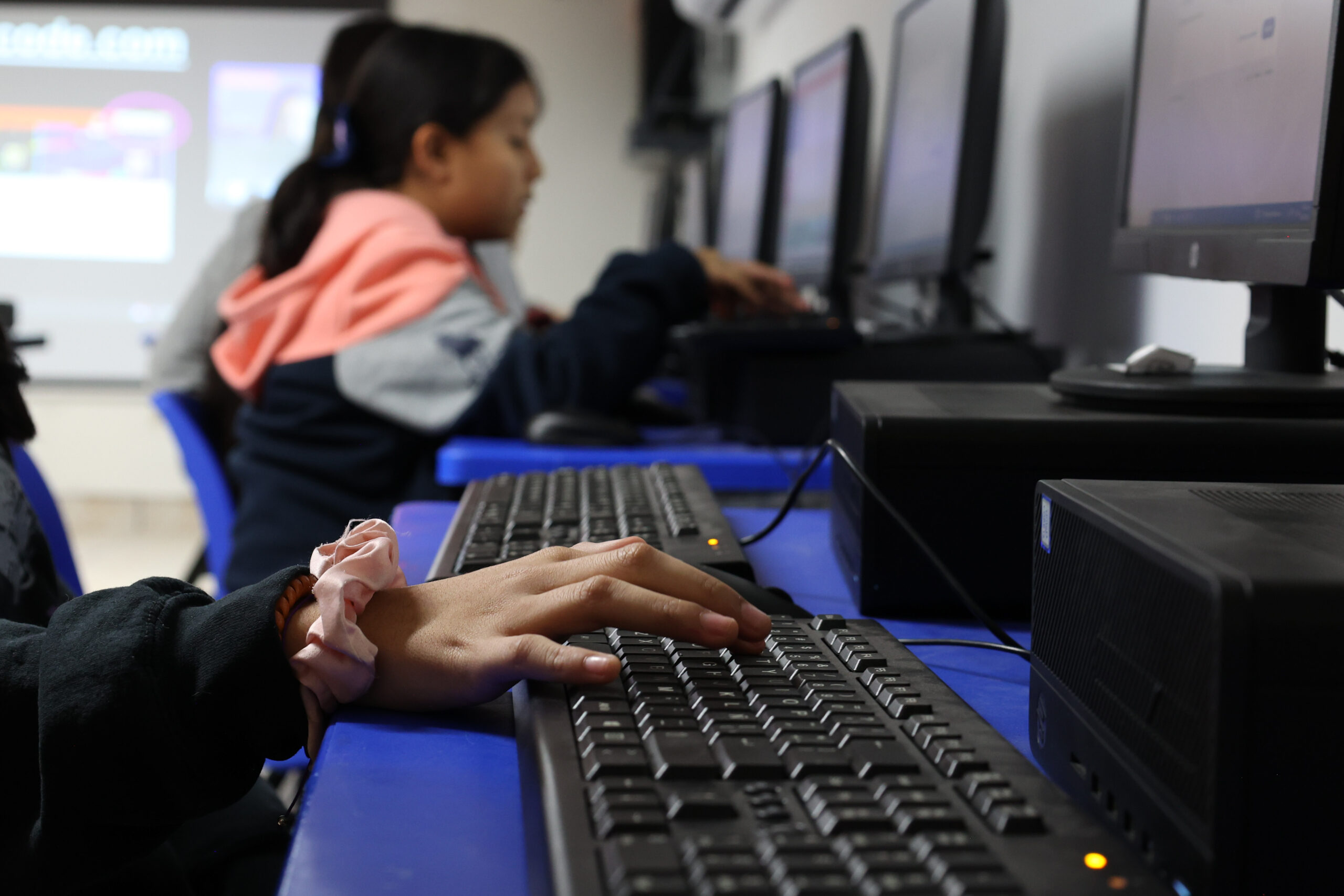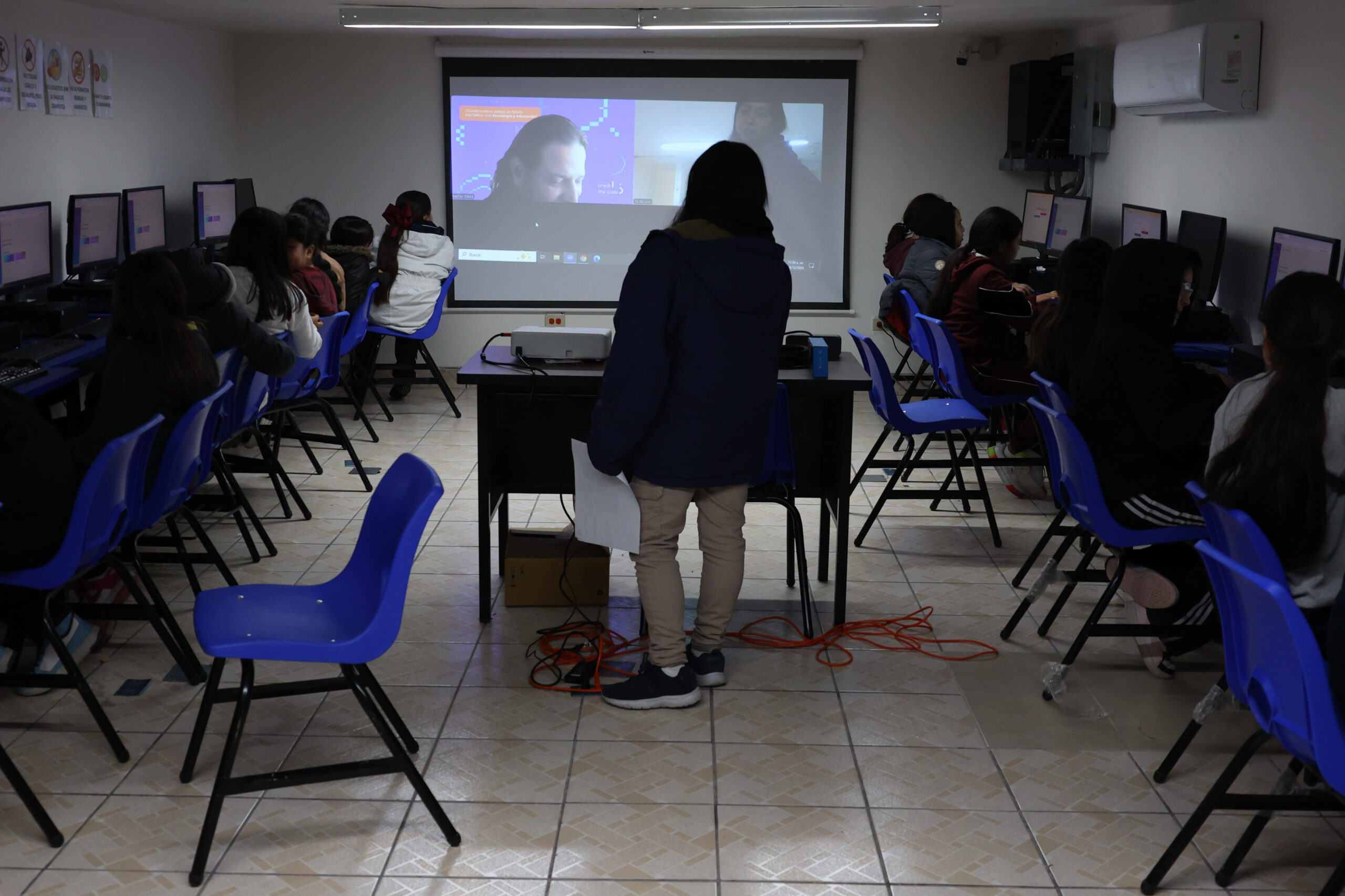 El aula de computación se convierte en un espacio de aprendizaje y cooperación una vez a la semana. Acompañadas de una facilitadora, el grupo escucha a un capacitador de la organización Crack the Code, quien explica paso a paso cómo programar.