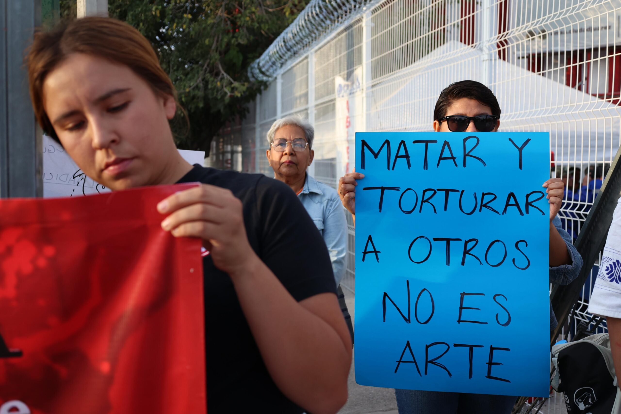 Las personas manifestantes se situaron en la entrada a la plaza, donde gritaron consignas como “Ni arte ni cultura, es tortura’ y “No a la tauromaquia, vayan a terapia” a las personas que ingresaban al lugar y a quienes circulaban a esa hora por la avenida Francisco Villa.