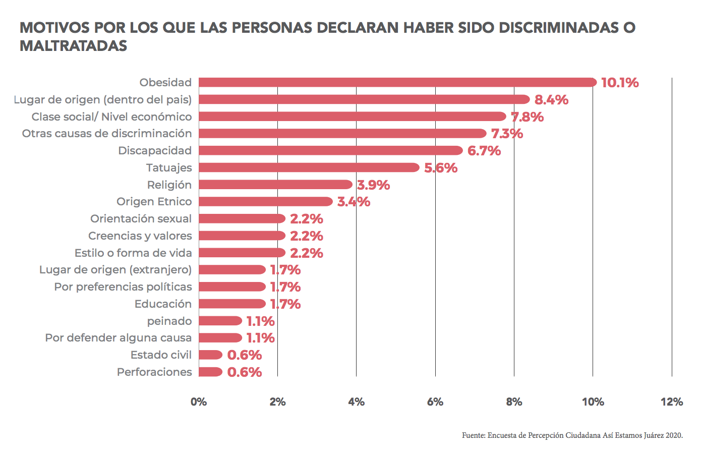 Ciudad Juárez, Chihuahua.— De acuerdo con la Encuesta de Percepción Ciudadana 2020 del sistema de indicadores Así Estamos Juárez, los principales motivos de discriminación en el municipio de Juárez durante el último año fueron obesidad, lugar de origen y nivel socioeconómico. El porcentaje global de personas que dijeron haber sido discriminadas en Juárez durante el último año fue de 9.1 por ciento; de ellas, el 10.1 fue por obesidad, el 8.4 por su lugar de origen (dentro del país) y el 7.8 por su nivel socioeconómico. Asimismo el 6.7 dijo haber sido discriminado por contar con alguna discapacidad, 5.6 por tener tatuajes, 3.9 por su religión y 2.4 por su origen étnico. A estas le siguen orientación sexual, creencias y valores, y estilo de vida con 2.2 por ciento, y lugar de origen (fuera del país), preferencias políticas y educación con 1.7 por ciento.