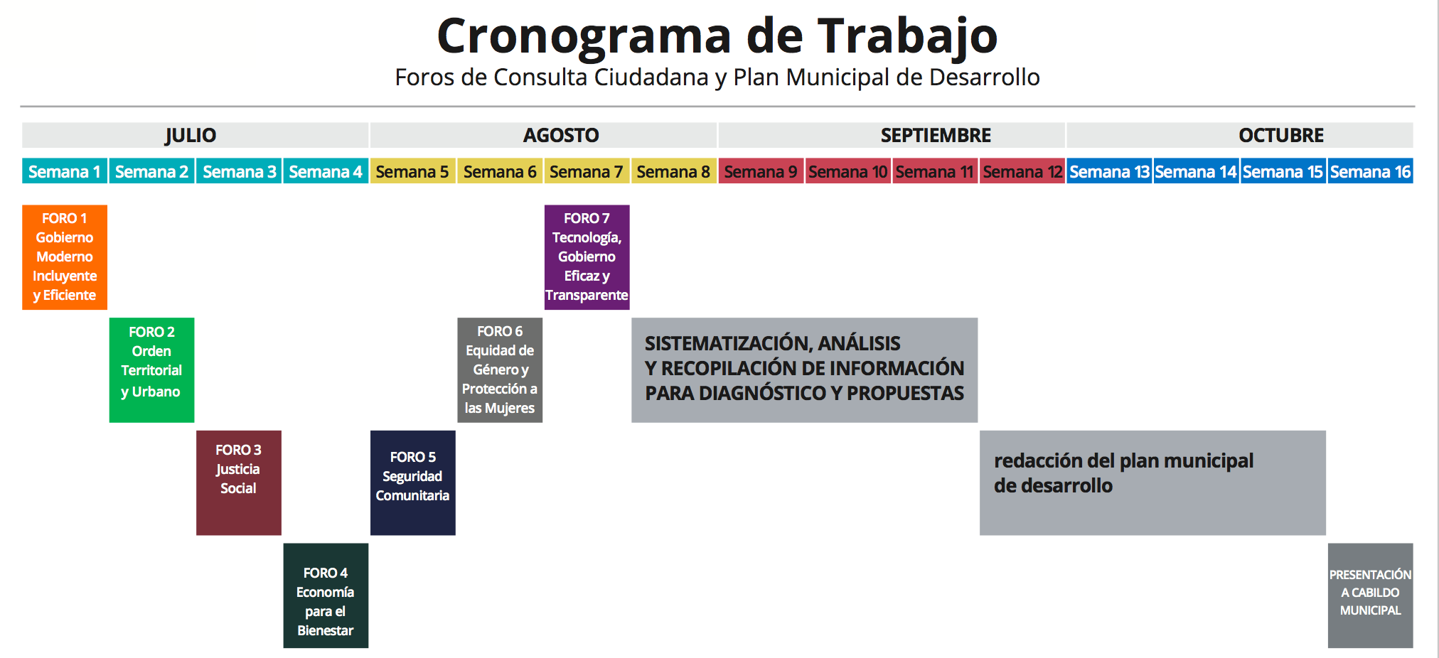 Ciudad Juárez, Chihuahua.— De acuerdo con el cronograma de trabajo para le presidencia municipal de Juárez que presentó el ahora virtual ganador de la contienda, Cruz Pérez Cuéllar (Morena), previo al inicio de su administración se realizarían foros de consulta ciudadana para la conformación del Plan de Desarrollo Municipal (PMD). De acuerdo con el cronograma, se realizarán siete foros de manera semanal durante los meses de julio y agosto para abordar los siguientes temas: Foro 1: Gobierno moderno, incluyente y eficiente (primera semana de julio) Foro 2: Orden territorial y urbano (segunda semana de julio) Foro 3: Justicia social (tercera semana de julio) Foro 4: Economía para el bienestar (cuarta semana de julio) Foro 5: Seguridad comunitaria (primera semana de agosto) Foro 6: Equidad de género y protección a las mujeres (segunda semana de agosto) Foro 7: Tecnología gobierno eficaz y transparente (tercera semana de agosto) Luego de estas siete semanas iniciaría un proceso de sistematización, recopilación, análisis de información para diagnóstico y propuestas. A partir de la última semana de septiembre y hasta la tercera semana de octubre se redactaría el Plan Municipal de Desarrollo que sería presentado la última semana de octubre en Sesión de Cabildo. Hoy Pérez Cuéllar confirmó que “en Julio y agosto, se realizarán foros especializados, como lo habíamos prometido para poder llegar en septiembre ya con una idea más clara de lo que vamos a hacer”.