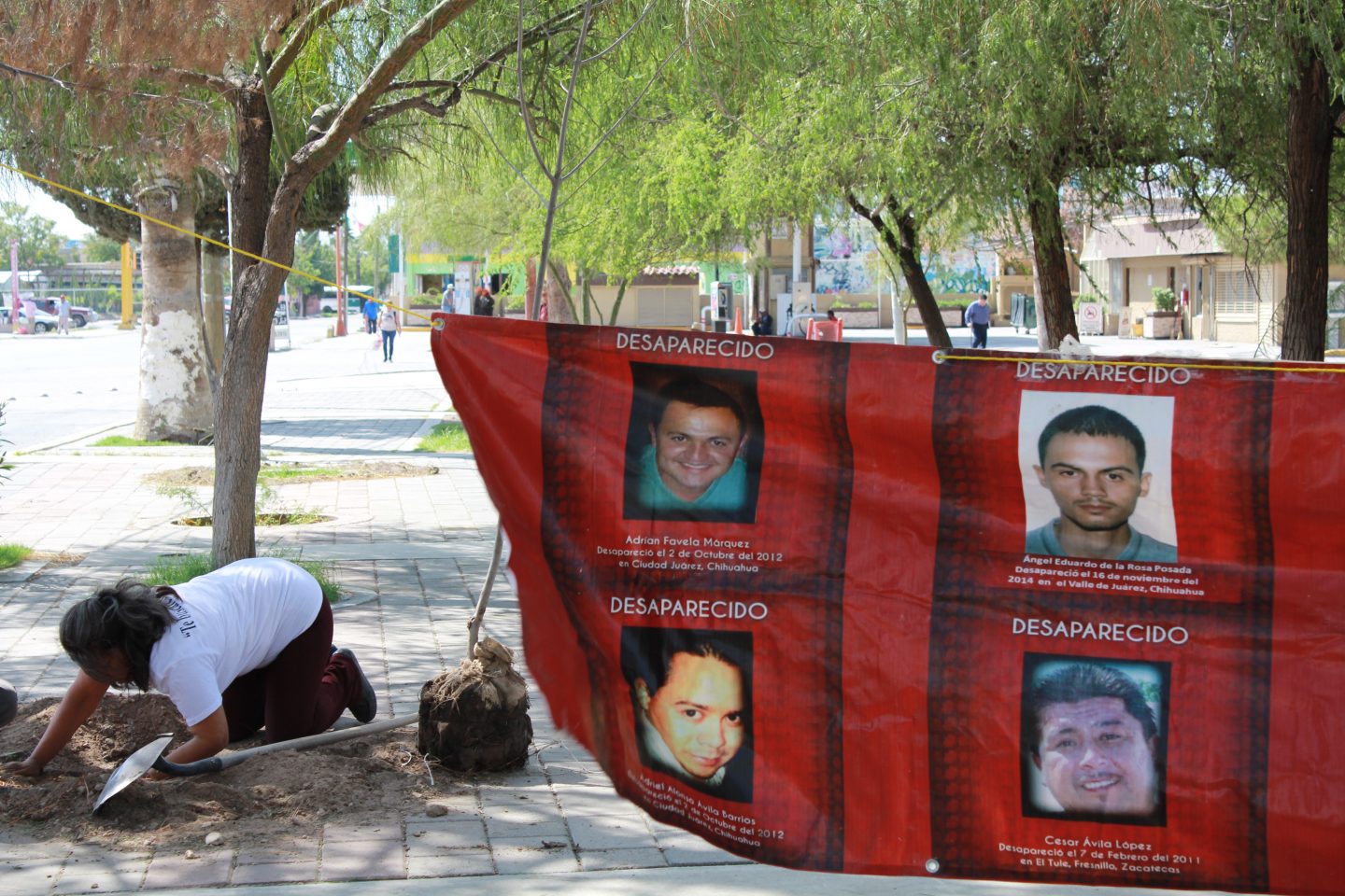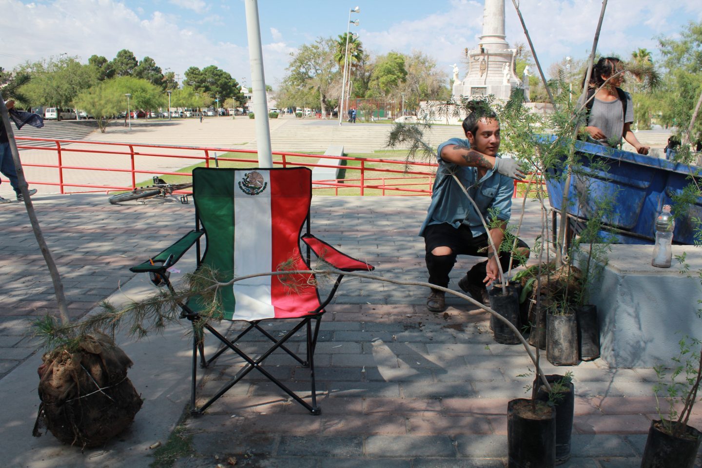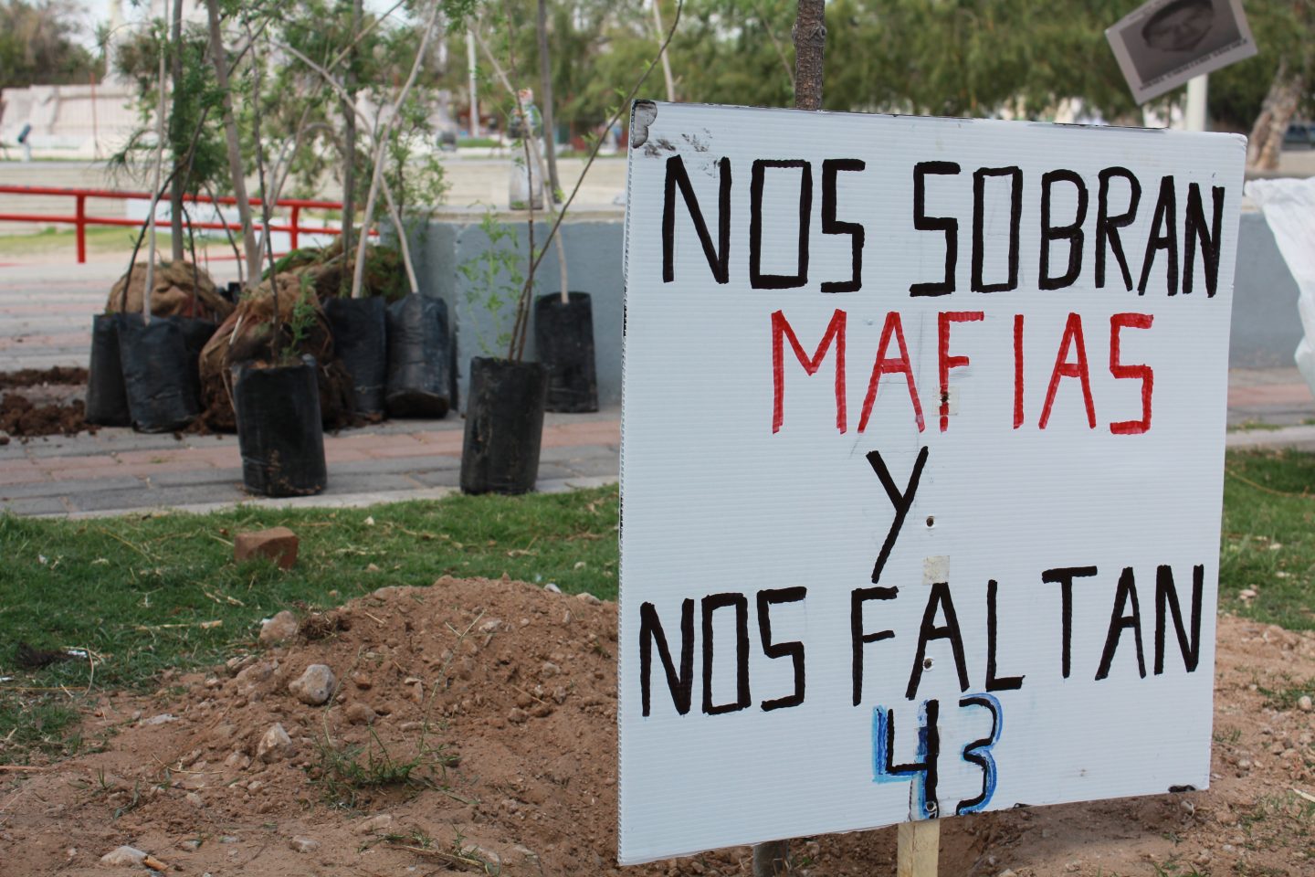 Ciudad Juárez, Chihuahua.— Daniel Delgadillo camina por la plaza del Monumento a Benito Juárez. Conoce cada espacio. Va señalando y sus historias crecen como árboles cuando dice “mira, ese moro de allá, yo lo planté cuando estaba en sexto año”. “Allá, ese es un fresno”, dice. “Y allá talaron dos fresnos que tenían más de ochenta años”. Daniel Delgadillo tiene 62 años. Hace más de 50 años que trepaba algunos de los árboles que quedan de entonces. Hoy vino para, igual que cuando estaba en sexto de primaria, sembrar. Sólo que esta vez serán 43 árboles, como 43 estudiantes desaparecidos. Cada árbol tendrá un nombre y, por lo tanto, una historia. Los estudiantes de la Normal Rural Isidro Burgos de Ayotzinapa cumplen cuatro años desaparecidos y el Colectivo Árboles en Resistencia así los recuerda. Daniel es ingeniero agrónomo, en parte, por estos árboles que rodean el monumento. Recuerda que su padre le enseñó a cuidarlos. Y recuerda que ahí donde se ve el principio de dos troncos había dos fresnos. En 2016 fueron cortados porque estorbaban el espacio para un mitin de Enrique Serrano como candidato a gobernador, cuenta Daniel. “Nosotros sembramos hoy 43 árboles, pero los vamos a cuidar”, dice. Cuando reclamaron la tala de los dos fresnos les respondieron que pondrían 20 árboles más. “Sí los pusieron, pero sólo eso hicieron: sembrarlos. Ya no están, se murieron”, cuenta Daniel. En la siembra en conmemoración a los 43 normalistas plantaron huizache, fresno y pino afgano, especies resistentes al clima desértico. A la actividad se sumaron otras organizaciones. Por ejemplo, llegó Hilda Ávila, del Centro de Derechos Humanos Paso del Norte, una organización que acompaña a los familiares de víctimas de desaparición forzada y sobrevivientes de tortura. Hilda busca a su hermano. También se unieron del Frente contra la Militarización, de Fedefam, entre otros, con el objetivo de dejar los 43 árboles. “Ese es el objetivo simbólico, pero además de eso reforestar nuestra ciudad, es una cosa ligada a la otra, no es un acto meramente simbólico. Ya que desde el colectivo árboles en resistencia nos estamos comprometiendo a que por lo menos el primer año vamos a trabajar en coordinación con Parques y Jardines para que los árboles tengan un desarrollo pleno”, dijo Jorge García, miembro de la agrupación. “Plantaciones se hacen todos los años, pero el problema es la simulación, porque la mayoría de los eventos no trascienden: plantan, se toman la foto y se van. La plantación de hoy tiene que trascender hasta que los árboles sean adultos”, dijo Jorge García.