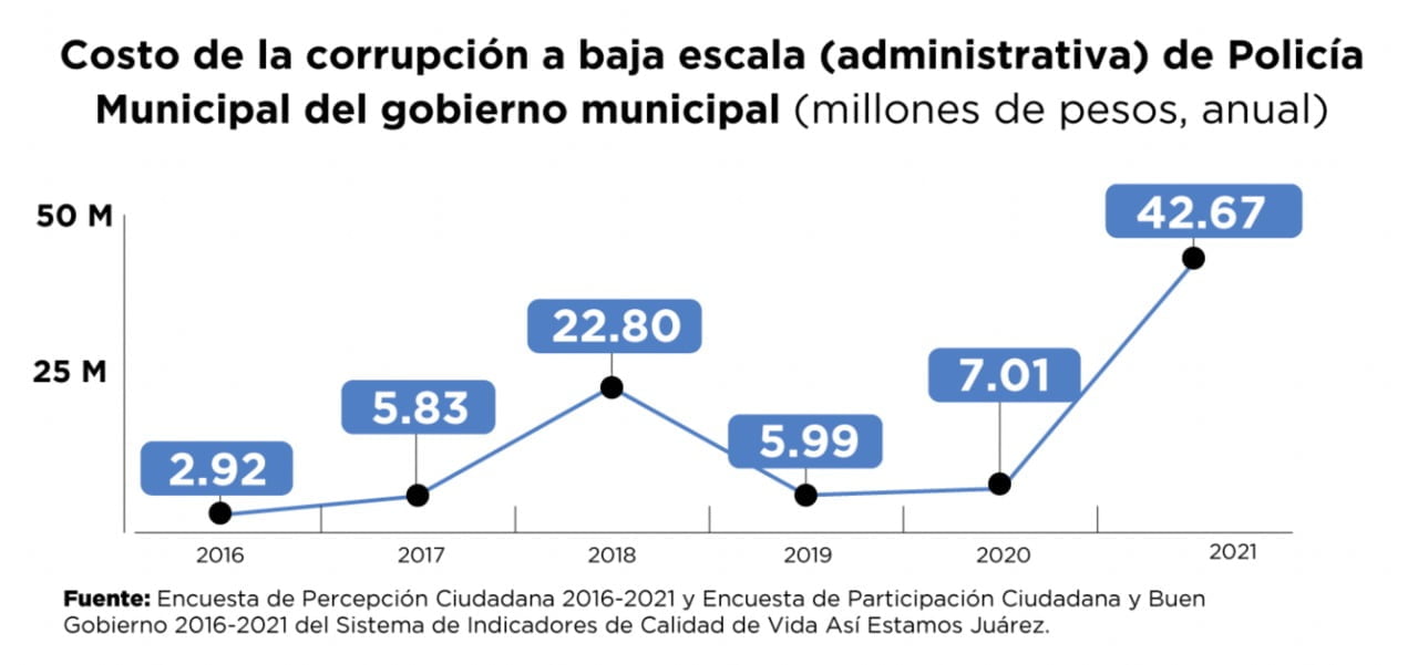 Ciudad Juárez, Chihuahua.— La Secretaría de Seguridad Pública Municipal (SSPM) y la Coordinación General de Seguridad Vial son las dependencias que más corrupción administrativa (sobornos) cuestan, con una estimación de 66 millones de pesos, de acuerdo con el ‘Informe de Corrupción 2022’ de la organización Plan Estratégico de Juárez (PEJ). Por otra parte, la Guardia Nacional y la Policía Estatal representan a las instituciones más corruptas en sus respectivos niveles de gobierno con más de 2 millones en sobornos cada una. El ‘Informe de Corrupción 2022’ muestra que el costo anual total estimado de corrupción administrativa en 2021 de la SSPM fue de 42 millones 673 mil 302 pesos. Esta es la cifra más alta que se ha pagado a la Policía Municipal por sobornos en los últimos años.