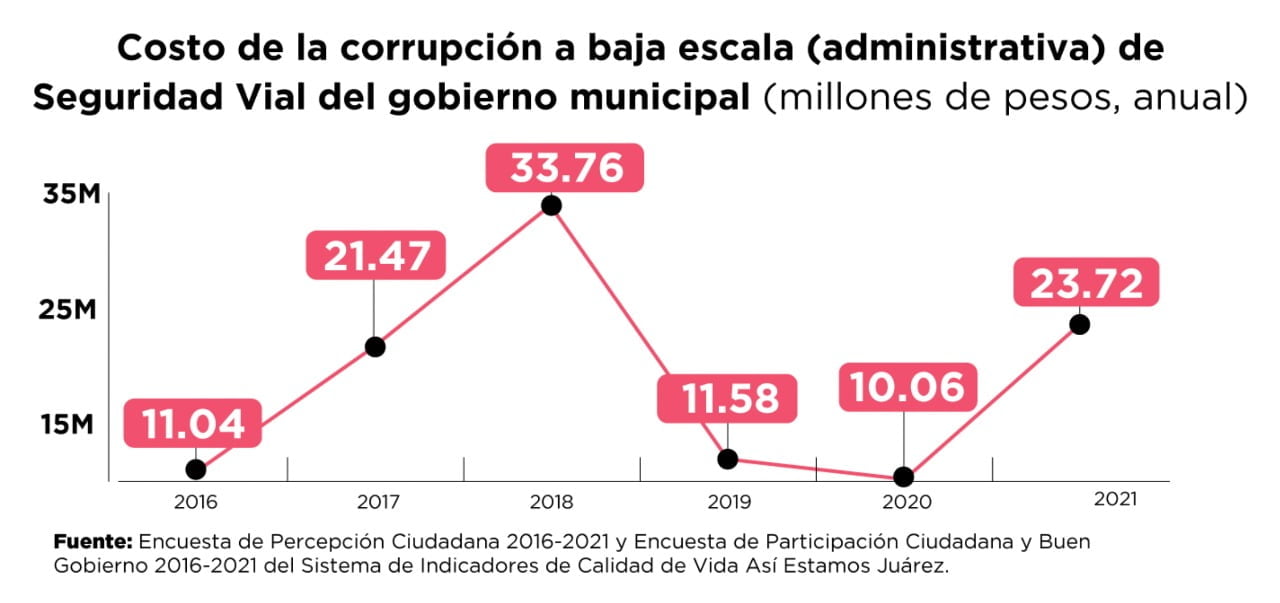 El director de Plan Estratégico de Juárez, Sergio Meza de Anda, propuso implementar un sistema de pago inmediato de multas de Tránsito y cámaras en patrullas de Policía y Seguridad Vial para reducir el riesgo de corrupción administrativa. El ‘Informe de Corrupción 2022’ muestra que en general el año pasado hubo un costo anual total estimado de corrupción de 83 millones 322 mil 498 pesos, que representa un aproximado de lo que pagó la ciudadanía de Juárez en sobornos al Municipio, Estado y la Federación. El reporte indica que el monto anual total estimado del Gobierno Municipal fue de 69 millones 620 mil 182 pesos, del Gobierno del Estado de 9 millones 181 mil 227 pesos y, por último, del Gobierno Federal de 4 millones 521 mil 089 pesos. La coordinadora de Así Estamos Juárez, Érika Donjuán Callejo explicó que para las estimaciones del informe se usaron las cantidades de soborno promedio que aseguró haber pagado la ciudadanía consultada para la ‘Encuesta de Participación Ciudadana y Buen Gobierno 2021’.