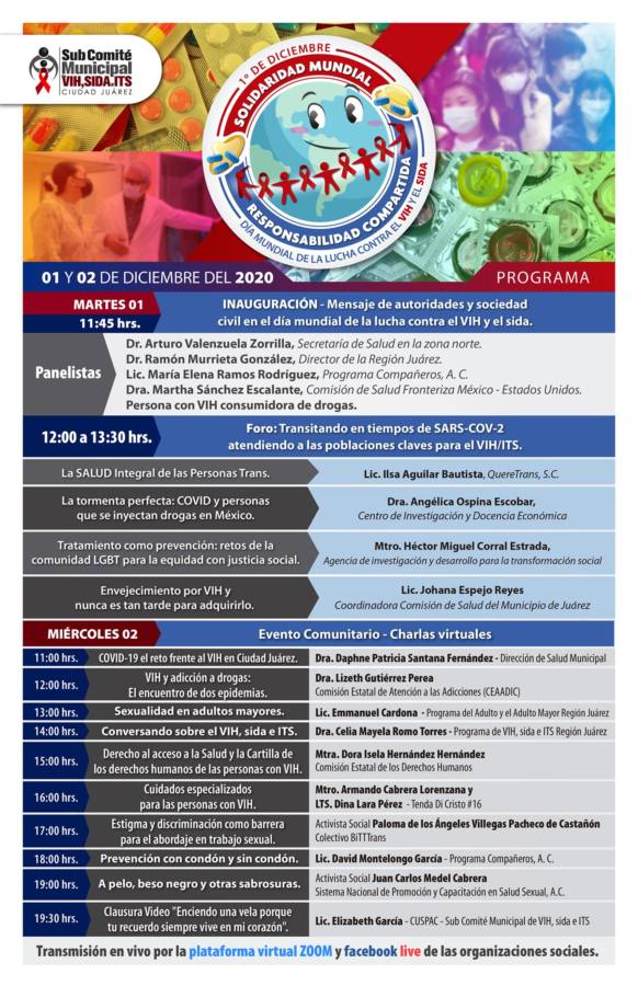 Ciudad Juárez, Chihuahua.— Organizaciones de la sociedad civil y autoridades sanitarias participarán en una serie de charlas virtuales el próximo primero de diciembre por el Día Mundial de la Lucha contra el VIH y el Sida.  El Subcomité de VIH, SIDA e ITS de Ciudad Juárez es el organizador del ciclo de conferencias que arrancará a las 11:45 de la mañana con un mensaje del titular de la Secretaría de Salud Zona Norte, Arturo Valenzuela Zorrilla; el director de la Región Juárez, Ramón Murrieta González; la directora de la organización Programa Compañeros, María Elena Ramos; la doctora Martha Sánchez Escalante de la Comisión de Salud Fronteriza México – Estados Unidos, así como el testimonio de una persona con VIH consumidora de drogas. Las siguientes charlas, que forman parte del foro ‘Transitando en tiempos de SARS-CoV-2 atendiendo a las poblaciones claves para el VIH/ITS’, están programadas para iniciar a las 12:00 y finalizar a las 13:30 horas. De acuerdo con el director del Sistema Nacional de Promoción y Capacitación en Salud Sexual (SISEX), Juan Carlos Medel Cabrera, con las ponencias buscan “movilizar actores claves para la prevención localizada y la atención integral que garantice el acceso a la salud con perspectiva de género, derechos humanos y de cara a la pandemia del SARS-CoV-2”. Para el día siguiente tendrán una serie de ‘eventos comunitarios’ que también consisten en 10 pláticas presentadas por integrantes de organizaciones que trabajan los temas del VIH/Sida, trabajo sexual, consumo de drogas y derechos humanos.  Medel Cabrera recordó que en años anteriores los eventos comunitarios los realizaban al día siguiente del Día Mundial de la Lucha contra el VIH y el Sida en espacios públicos, pero debido a la contingencia sanitaria del COVID-19 tuvieron que cambiar la dinámica.  Los eventos de ambos días están dirigidos “a personas con VIH, tomadores de decisiones, personal de salud, organizaciones sociales, derechohumanistas y otras personas aliadas estratégicas”. En la clausura de la jornada se presentará el video ‘Encendiendo una vela porque tu recuerdo siempre vive en mi corazón’ realizado con mensajes para recordar a las personas con VIH que han muerto.  Aunque el material ya está terminado, Medel Cabrera mencionó que siguen recibiendo videos para posteriormente compartirlos en las redes sociales del subcomité; quien deseé realizar un video con un mensaje respetuoso encendiendo una vela puede comunicarse a la página de Facebook de SISEX. El subcomité está integrado por las asociaciones Programa Compañeros, el Sistema Nacional de Promoción y Capacitación en Salud Sexual (SISEX), La Tenda di Cristo #16, Cultura Sexual Preventiva (CUSPAC), el colectivo BiTTTrans y el Grupo Fanny Mujeres Transgénero. Asimismo participan la Dirección de Salud Municipal, Programa VIH, Sida e ITS Región Juárez, la Comisión de Salud Fronteriza México-Estados Unidos, la Comisión Estatal de Derechos Humanos, la Comisión Nacional de Derechos Humanos, la Comisión Estatal de Atención a las Adicciones y la Comisión de Regidores de Salud Municipal. Tanto en las redes sociales de las organizaciones como en la del subcomité se compartirán los programas individuales de todas las charlas con sus respectivos códigos de ingreso a la plataforma Zoom, también se transmitirán en vivo en las páginas de Facebook de cada asociación.