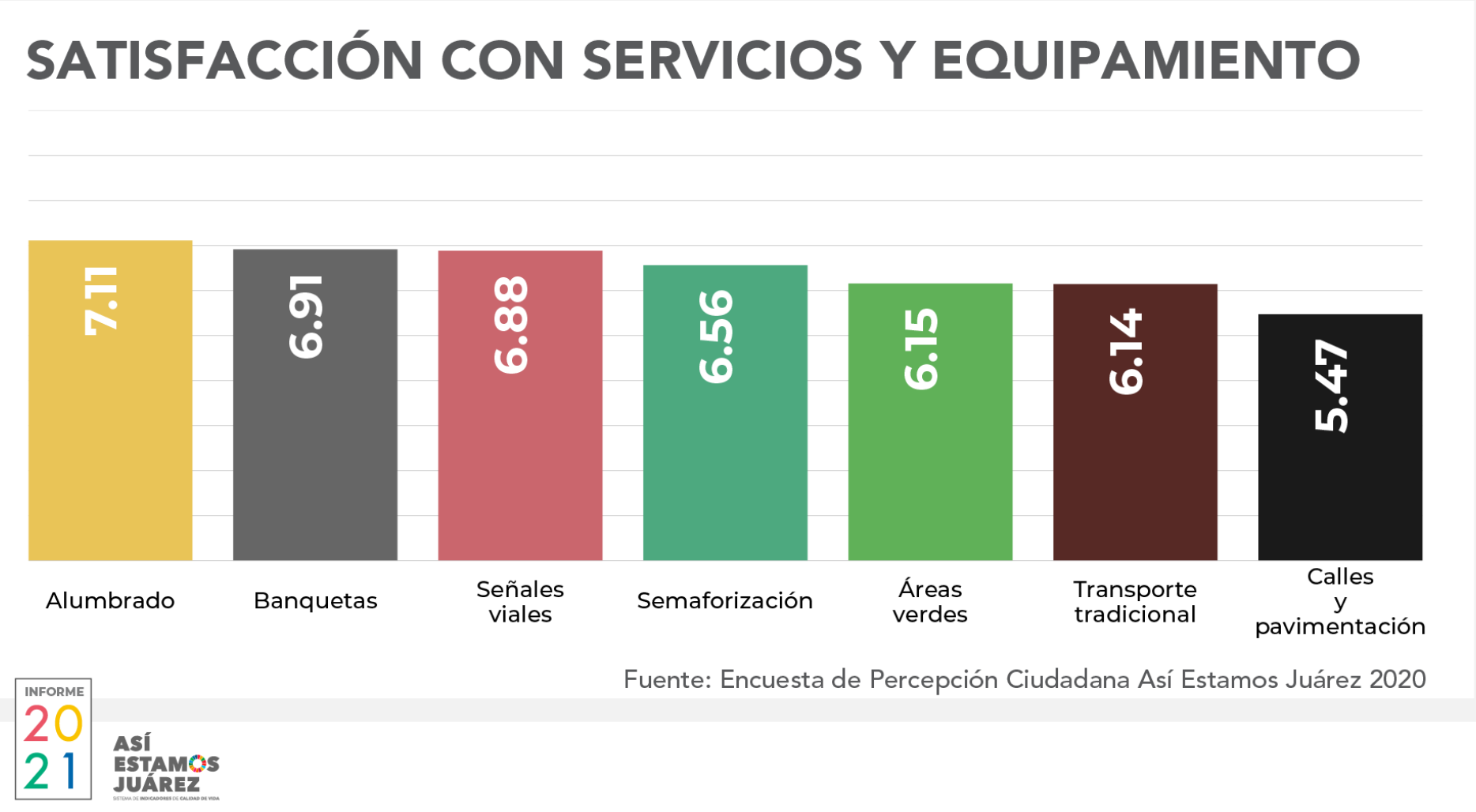La gestión ambiental mejor calificada fue la calidad del agua con 7.24 puntos de 10 posibles, y la peor, basura en las calles, con 5.29 puntos. Se registró en 2019 la mayor cantidad de vehículos motorizados en Juárez, con 586 mil 171. En cuanto a servicios de salud, los públicos tuvieron una leve mejora en la percepción ciudadana en cuanto a atención y calidad. Por otra parte, el promedio de personas por vivienda disminuyó a un mínimo histórico de 3.4 personas por vivienda. Mientras tanto, existen 70 mil 790 viviendas deshabitadas en el municipio, lo que “genera problemas a nuestra ciudad”, comentó Donjuán. En temas de educación, en 2020 la percepción ciudadana al respecto sufrió una caída que significó el mínimo histórico en cinco años. Los niveles básico, medio y superior fueron calificados con 7.24, 7.27 y 7.47 puntos de 10 posibles, respectivamente.