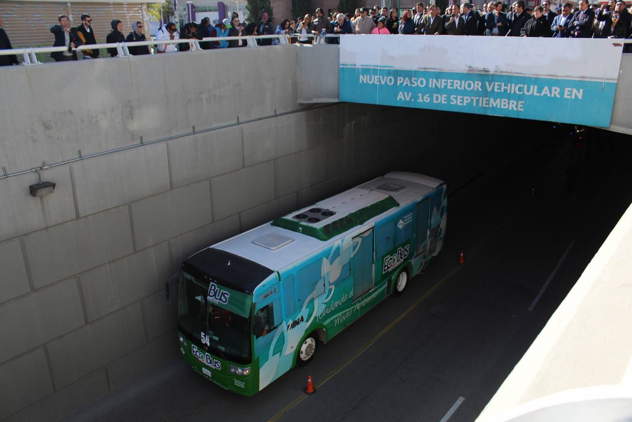 Ciudad Juárez, Chihuahua.— Ante funcionarios estatales y municipales, este día se llevó a cabo la presentación del ‘Corredor Troncal Tecnológico’ de la segunda ruta del sistema de transporte semimasivo ‘Ecobús’. La presentación contempló una prueba técnica en la que una de las unidades del semimasivo circuló por el túnel de la avenida 16 de Septiembre, con la finalidad de comprobar que en el circuito caben tres unidades del mismo tamaño. Con la creación de la segunda ruta, que partiría de la carretera Panamericana (a la altura del aeropuerto), para seguir por las avenidas Tecnológico, Paseo Triunfo de la República y 16 de septiembre, esta última volvería a ser de doble sentido. El Presidente Municipal de Juárez, Armando Cabada Alvídrez, destacó que el proyecto es resultado de la coordinación entre los tres órdenes de gobierno, que durante el próximo año destinarán alrededor de 200 millones de pesos para la segunda ruta troncal y el Paseo de las Luces en la avenida Juárez.