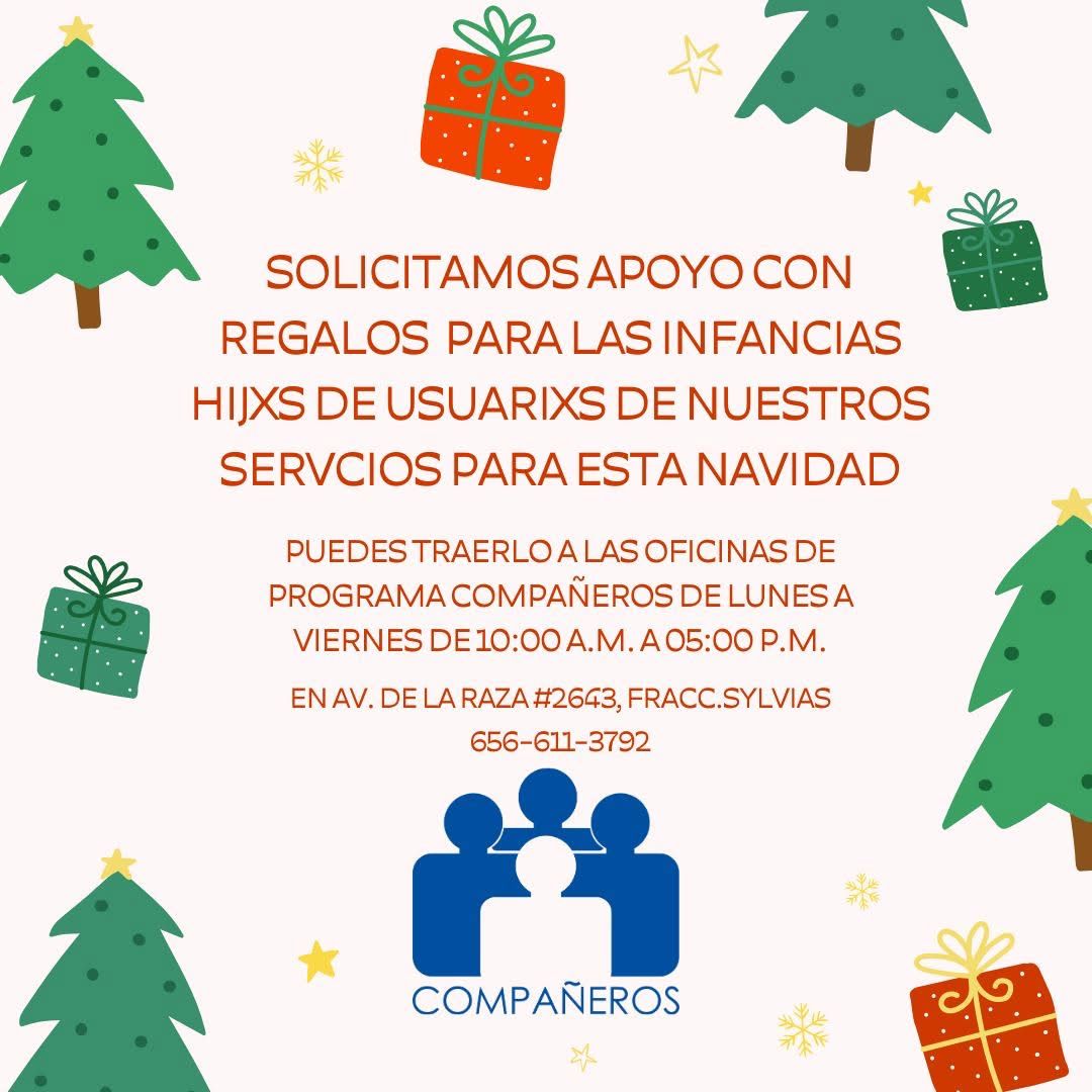 Ciudad Juárez, Chihuahua.— La organización Programa Compañeros invita a la ciudadanía a solidarizarse con la donación de regalos para celebrar la navidad con las hijas e hijos de las personas beneficiarias.