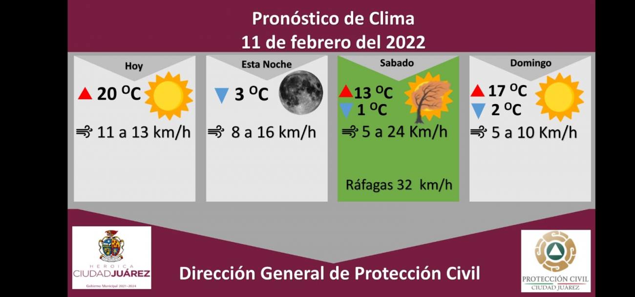 Ciudad Juárez, Chihuahua.— La Dirección de Protección Civil municipal informó que se espera que el frente frío número 29 se aproxime a la frontera norte de México, lo cual podría ocasionar rachas fuertes de viento en el norte y noreste del país para esta noche. El titular de la dependencia, Roberto Briones Mota, informó que para hoy se espera una temperatura máxima de 20 grados centígrados y mínima de 3, con vientos que oscilarán entre los 8 y 16 kilómetros por hora. Para mañana se emite un alerta verde por ráfagas que alcanzarán los 32 kilómetros por hora, y se espera una temperatura máxima de 20 grados y mínima de 1. Para el domingo se espera una temperatura máxima de 17 grados y mínima de 2 grados. Debido al pronóstico de fuertes ráfagas de viento, la Dirección de Protección Civil pide conducir con precaución y a baja velocidad, así como evitar circular cerca de panorámicos, bardas, árboles y fincas abandonadas que pueden colapsar. También se recomienda revisar que no haya cornisas y fachadas en mal estado que puedan producir caídas de escombros, así como retirar de las azoteas aquellas macetas y todos los objetos que puedan caer a la calle para evitar accidentes.