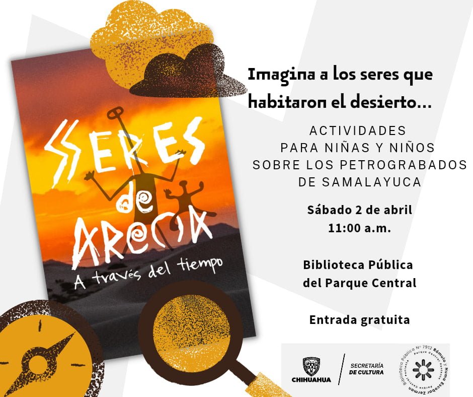 Ciudad Juárez, Chihuahua.- Este sábado 2 de abril se proyectará el documental Seres de arena a través del tiempo, del director Luis Ángel Salazar, en la biblioteca pública del Parque Central Rómulo y Numa.  A partir de las 11:00 de la mañana, las personas asistentes podrán participar en las diversas actividades que se realizarán con el objetivo de visibilizar la importancia de los petrograbados de Samalayuca, un sitio arqueológico que se encuentra dentro de la zona declarada como Área Natural Protegida por la Comisión Nacional de Áreas Naturales Protegidas (Conanp).  El evento está dirigido a las infancias y no se requiere de un registro previo para participar, pues no habrá cupo limitado a esta actividad cuya entrada es totalmente gratuita, informó personal de la biblioteca ubicada del lado Poniente del Parque Central.  “Dibujemos y coloreemos con nuestras niñas y nuestros niños, mientras imaginamos nuestras propias historias con los Seres de Arena”, indican en el evento de Facebook.  Además de la proyección del documental también se realizará un taller de petrograbado y al finalizar habrá una sesión de cuentacuentos que se relaciona con el Festival del Mole que se llevará a cabo en el mismo parque.  Para mayor información contactarse con la Biblioteca del Parque Central Rómulo y Numa, a través de sus redes sociales o al teléfono (656) 170 4618.