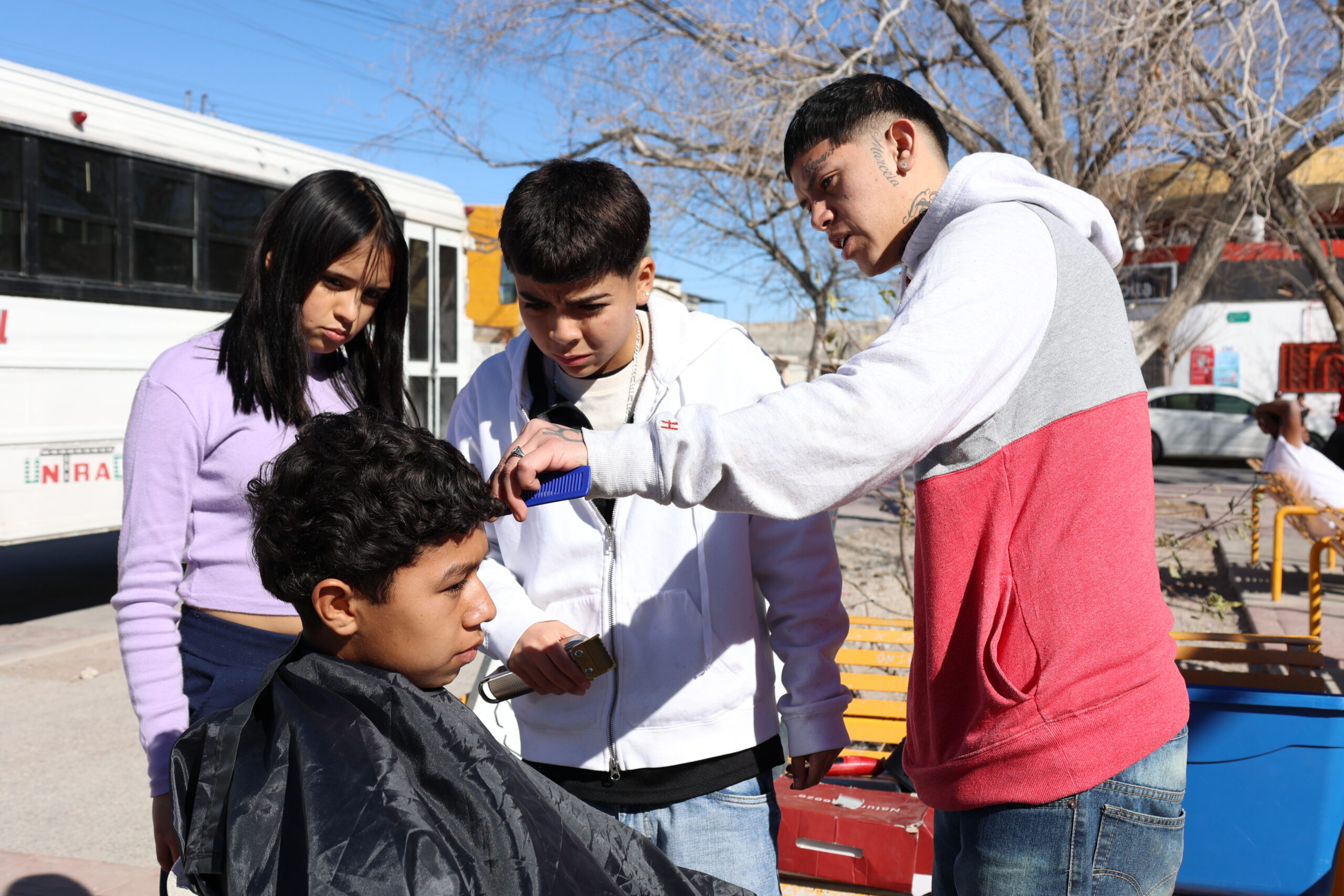 “¿Te quieres cortar el pelo?”, es la pregunta con la que el grupo de jóvenes recibe a las personas que llegan al parque, a quienes caminan rumbo a la tienda o pasan por ahí en bicicleta.