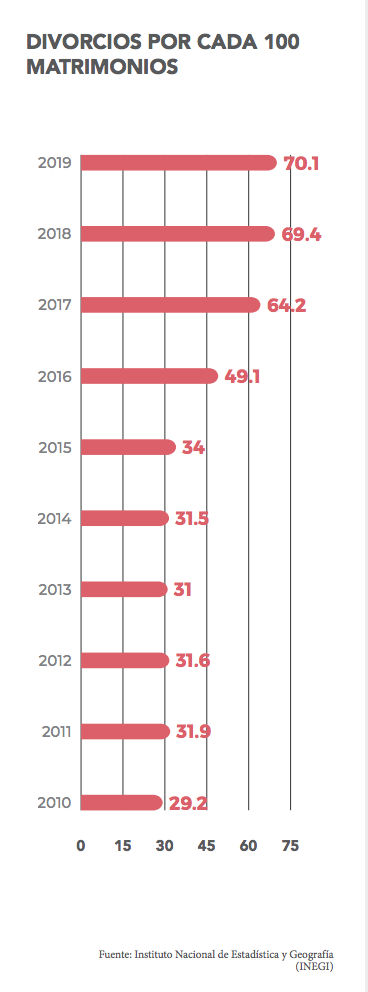Ciudad Juárez, Chihuahua.— Tanto el matrimonio como el divorcio son decisiones importantes para cualquier persona que lo tenga contemplado en su plan de vida. Son, además, trámites que se realizan ante una autoridad, procesos que modifican el estatus legal de una persona. Durante 2019 en Juárez se registraron 6 mil 046 matrimonios, más que el año anterior pero aún muy por debajo de los más de 8 mil trámites que se dieron en 2015. Desde entonces, la cifra se mantuvo a la baja. Por el contrario, en cuanto a divorcios, desde 2014 se ha mostrado una tendencia al alta, que va en 4 mil 236 casos registrados en 2019, de acuerdo con el Informe Así Estamos Juárez de la asociación civil plan Estratégico de Juárez. Estas cifras significan que por cada 10 nuevos matrimonios, otros 7 se divorcian.