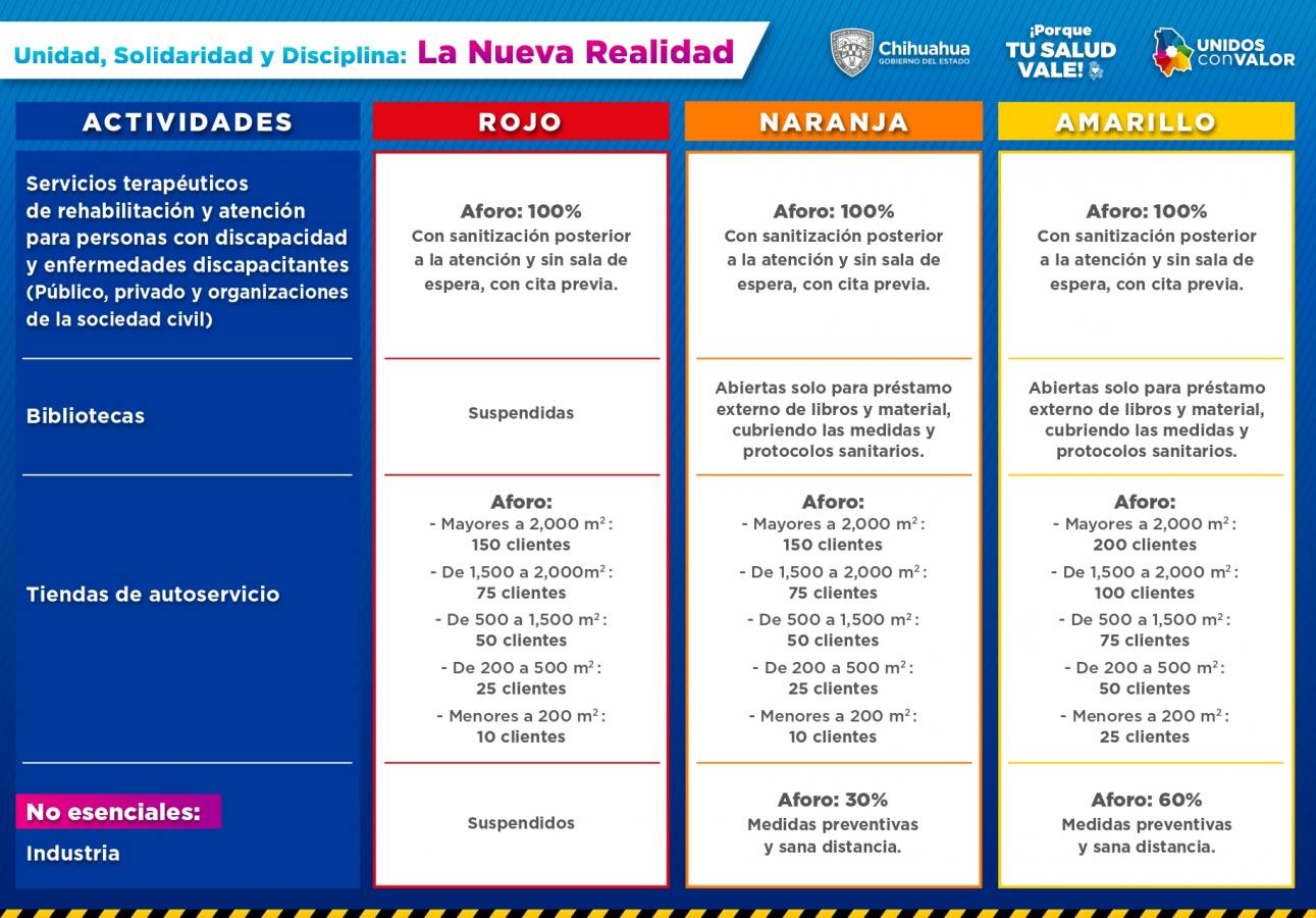 Ciudad Juárez, Chihuahua.— Ayer el gobernador Javier Corral Jurado presentó la nueva estrategia que se implementará en todo Chihuahua para atender la contingencia sanitaria del COVID-19. Se trata del decreto “Unidad, Solidaridad y Disciplina: La Nueva Realidad”, con el que se establecen nuevos horarios de atención en locales, distintos aforos en espacios públicos y otras medidas que deberán ser cumplidas por los sectores público, social y privado de todo el estado. Algunos de los cambios al sistema de semaforización COVID-19 explicados por el Gobernador consisten en que los restaurantes deberán cerrar a las 22:30 horas; a los eventos privados o reuniones en domicilios nada más podrán acudir 10 personas y entre semana tendrán que terminar a las 22:00 horas, mientras que los viernes y sábados, podrán ser hasta las 23:00 horas. Por otro lado, las autoridades consideraron que los centros comerciales ya podrán operar con un aforo del 25 por ciento, situación que no estaba permitida con el antiguo semáforo COVID, en el que se estipulaba que estos lugares solo abrirían al 50 por ciento hasta que el estado llegara al color amarillo. Deberán tener un control de entrada y salida con medidas de higiene y las zonas de comida dentro de los centros comerciales deberán cumplir las mismas medidas de prevención que los restaurantes, como la distancia entre cada mesa. Sobre el sector industrial, Corral Jurado comentó que no se puede regresar al confinamiento y suspender actividades laborales pues la economía se vería más afectada, por ello las medidas para las empresas manufactureras del rubro automotriz y aeroespacial cambiarán: la plantilla laboral de estas industrias incrementará del 50 al 60 por ciento, con base en el registro que tienen ante el Instituto Mexicano del Seguro Social. Para los servicios terapéuticos, la apertura permanece al 100 por ciento con todas las medidas de sanitización en cada cita y sin salas de espera; las bibliotecas solo estarán abiertas para el préstamo de libros y material; en el caso de las tiendas de autoservicio, el aforo será de acuerdo a su extensión o dimensión específica y las industrias no esenciales tendrán un aforo del 30 por ciento. Los hoteles mantienen su aforo al 30 por ciento, los restaurantes al 50 por ciento con los espacios de juegos infantiles cerrados y sin permiso para organizar eventos. Las mesas en estos lugares no podrán estar ocupadas por más de seis personas y cada mesa deberá tener una distancia de tres metros; los que tienen servicio de buffet, solo podrán operar en servicio a domicilio o para llevar. Salones de eventos, bares, centros nocturnos y casinos seguirán cerrados. Las estéticas y spas podrán recibir al 50 por ciento de su capacidad, los comercios, locales ambulantes, fijos y semifijos tendrán un horario de atención de las 11:00 a las 17:00 horas entre semana y los fines de semana desde las 10:00 a las 18:00 horas. Cines, museos, teatros, espectáculos deportivos y culturales, así como asambleas y celebraciones masivas seguirán suspendidas hasta nuevo aviso. A diferencia de las iglesias o centros de culto que podrán atender a las personas mediante citas personalizadas o individuales con todos los protocolos sanitarios. Las zonas ecoturísticas, parques y centros deportivos podrán operar entre semana desde las 6:00 hasta las 20:00 horas y los fines de semana hasta las 21:00. Las nuevas disposiciones y las que fueron modificadas fueron previamente aprobadas por el Consejo Estatal de Salud, además de estas también se acordó implementar mayores acciones para detectar casos positivos que permitan conocer la situación que atraviesa el estado. De acuerdo con el Gobernador, el objetivo es aplicar más pruebas moleculares de manera estratégica para detectar oportunamente los contagios y su línea de contacto, esto, explicó, permitirá ofrecer una mejor atención médica y disminuir el número de fallecimientos. Puntualizó en la importancia de cumplir con la sana distancia, el uso de cubrebocas, con las medidas en los espacios públicos, el constante lavado de manos y las demás medidas de higiene y prevención para evitar nuevos casos.