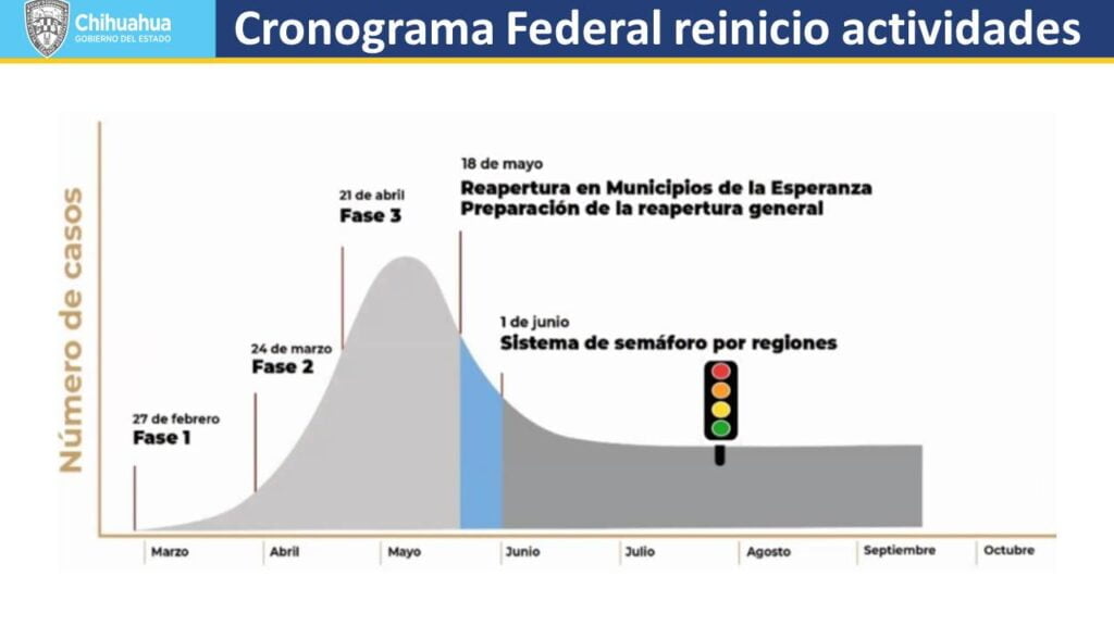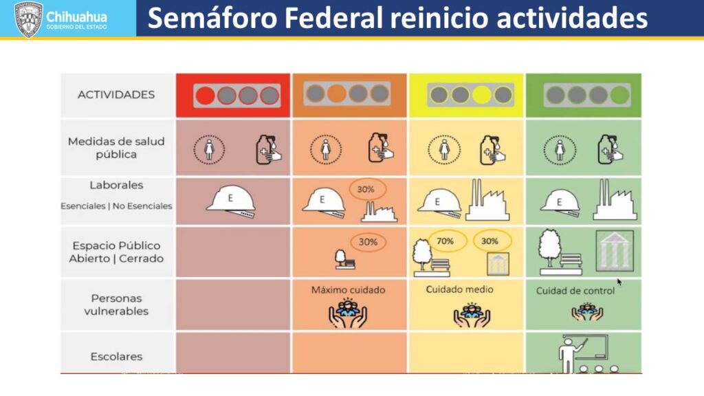Javier Corral informó que durante la Etapa 1 (a partir del primero de junio) las personas vulnerables deberán permanecer en aislamiento, y se establecerá transporte especial para personal de centros de trabajo con más de 500 empleados por turno. En esta fase los centros de trabajo deberán implementar pruebas serológicas (o rápidas), distribuir los horarios de trabajo de tal manera que se conserve la sana distancia, considerar el grado de vulnerabilidad de los empleados y restringir el uso de áreas comunes, a excepción de los comedores. Tampoco se permitirán reuniones de más de 10 personas en lugares cerrados, por lo que se promoverá el trabajo desde casa y la realización de viajes esenciales únicamente. La Etapa 2 será similar, pero la Secretaría de Salud podrá determinar incremento en la proporción de operaciones y la integración de nuevos sectores económicos. En esta fase estarán prohibidas las reuniones de más de 50 personas en lugares cerrados. En la Etapa 3 los sectores económicos y sociales podrán regresar a sus operaciones al 100 por ciento, personas vulnerables podrían reintegrarse a sus actividades y podrán abrir sus instalaciones los planteles escolares. En todos los casos será la Secretaría de Salud estatal la que dicte el avance de las fases y, de considerarlo necesario, podría decidir regresar a las etapas 1 y 2. Corral Jurado indicó que ninguno de los municipios considerados como “de la esperanza” en el estado de Chihuahua reanudará sus actividades.