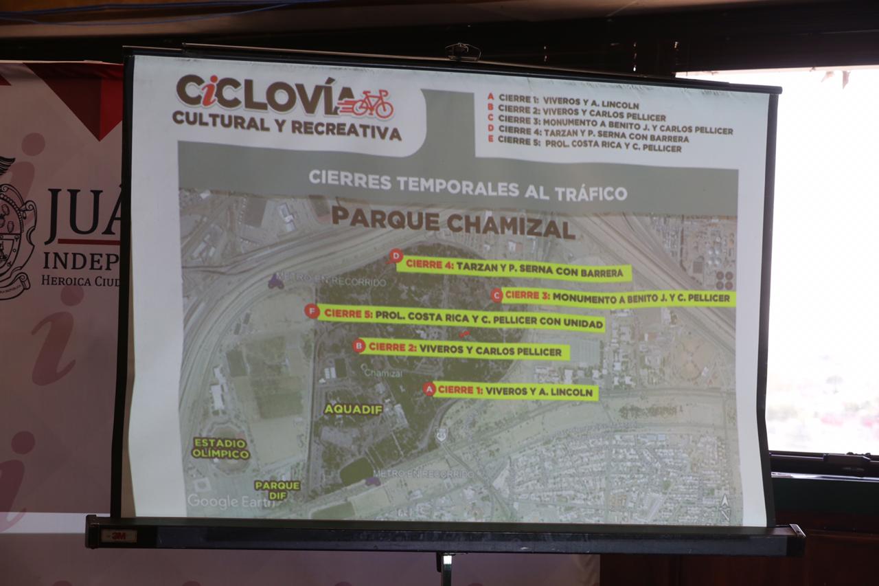 Ciudad Juárez, Chihuahua.— El Gobierno Municipal de Juárez informó que a partir de este sábado 5 de septiembre se reanudará la Ciclovía Recreativa, como una alternativa familiar para promover la sana convivencia con las medidas de higiene necesarias para prevenir casos de COVID-19. El alcalde Armando Cabada Alvídrez precisó que la ciclovía se realizará todos los fines de semana (sábados y domingos) en El Chamizal, de 7 de la mañana a 2 de la tarde, e integrará actividades de urbanismo táctico, cultura ciudadana y medio ambiente. La ciclovía comprenderá un circuito de 3.8 kilómetros, por lo que se cerrará el acceso de vehículos del parque para que los visitantes puedan transitar sin riesgos. Se informó que se contará con un ‘Nodo Cultural’ en el Museo de Arqueología e Historia de El Chamizal, donde los visitantes podrán acceder a exposiciones al aire libre, talleres y música desde las 8 de la mañana. Para el evento se contará con dos estacionamientos para 500 automóviles, ubicados en la calle Costa Rica y cerca del área de la aduana. Empleados municipales ofrecerán gel desinfectante y cubrebocas, y tendrán áreas de hidratación para las personas que lo necesitan. Asimismo personal de seguridad realizará rondines para asegurar que se conserve la sana distancia. Se informó que se tendrán cierres parciales en El Chamizal en Viveros y Abraham Lincoln, Viveros y Carlos Pellicer, monumento a Benito Juárez y Carlos Pellicer, Tarzán y Serna y prolongación Costa Rica y Pellicer. En el operativo participarán la oficina de Administración de la Ciudad, Oficina de Resiliencia, Secretaría de Seguridad Pública Municipal, coordinación general de Seguridad Vial, Servicios Públicos Municipales, Instituto Municipal del Deporte y Cultura Física, Instituto Municipal de la Cultura, Operadora Municipal de Estacionamientos y Dirección de Salud Municipal.