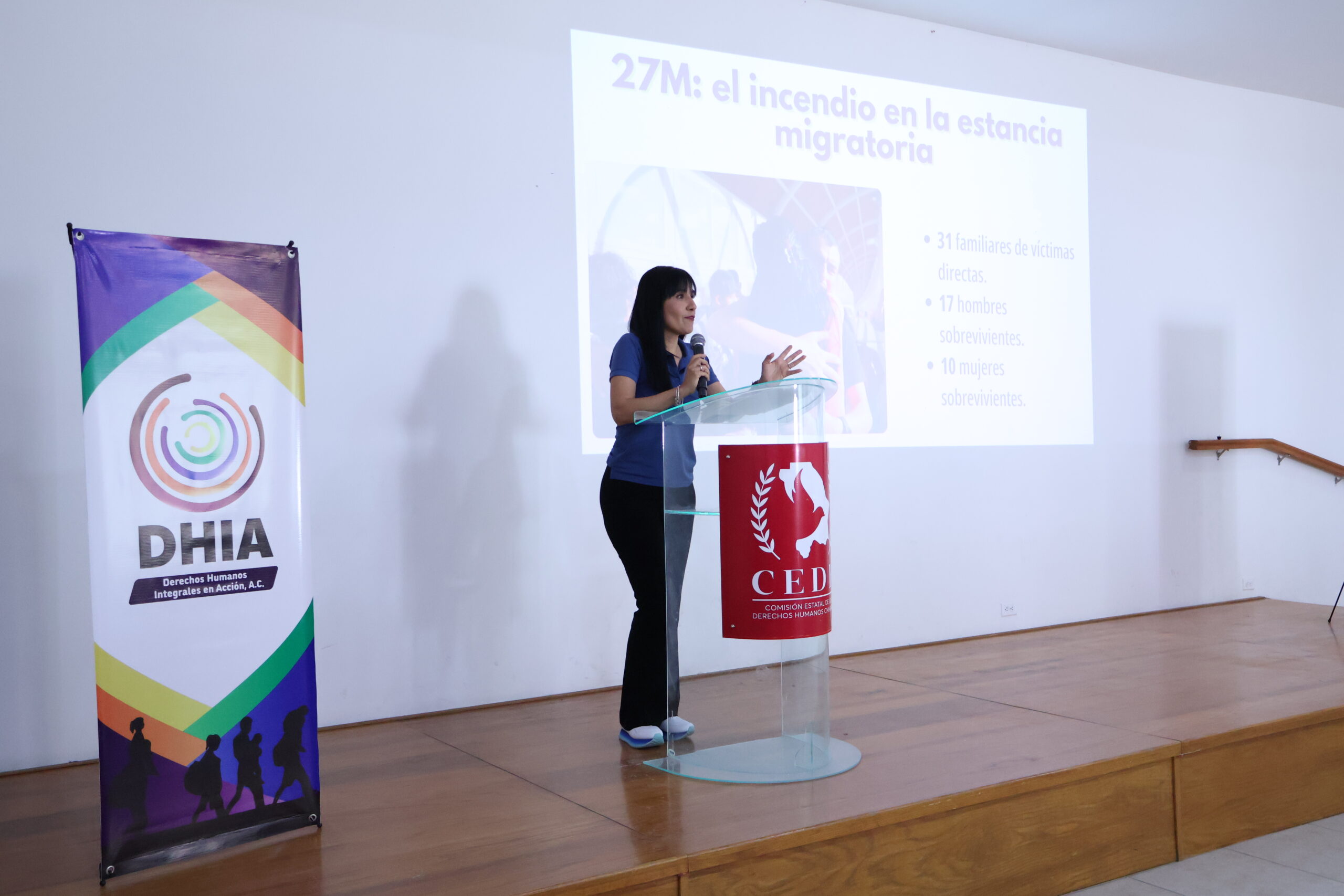 La directora de DHIA, Blanca Navarrete García, comentó que la atención al caso del incendio de la estancia migratoria “ha sido un proceso complejo” para la organización, pues derivó en múltiples esfuerzos para garantizar una atención digna e integral a las personas sobrevivientes y sus familias, así como a las de los fallecidos.
