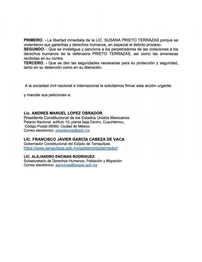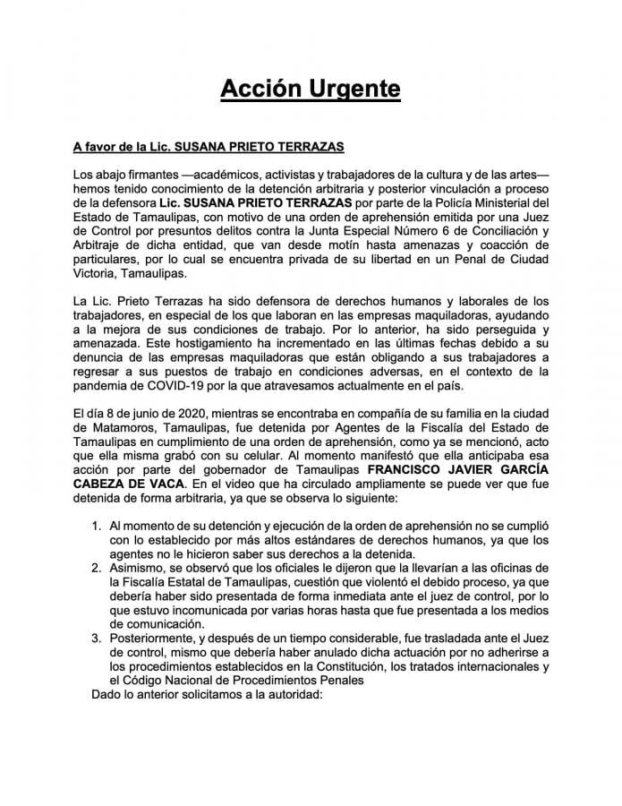 Académicos, activistas y trabajadores de la cultura y las artes publicaron una carta dirigida a AMLO, al gobernador Francisco Javier García Cabeza de Vaca (Tamaulipas) y al subsecretario de Derechos Humanos, Alejandro Encinas Rodríguez, para manifestar su rechazo a la detención de Prieto Terrazas y exigir su liberación inmediata. La ‘Acciones Urgente’ señala que los agentes que detuvieron a la abogada no le hicieron saber sus derechos, la llevaron a la Fiscalía Estatal de Tamaulipas en vez de presentarla inmediatamente ante un juez (manteniéndola incomunicada durante horas) y que la detención debió ser anulada por no adherirse a los procedimientos establecidos por la Constitución, los tratados internacionales y el Código Nacional de Procedimientos. Asimismo demanda la libertad inmediata de Prieto Terrazas, que se investigue y sanciones a los perpetrados de violaciones a sus derechos humanos y que se den le brinden las medidas de seguridades necesarias para su protección durante y luego de su detención.