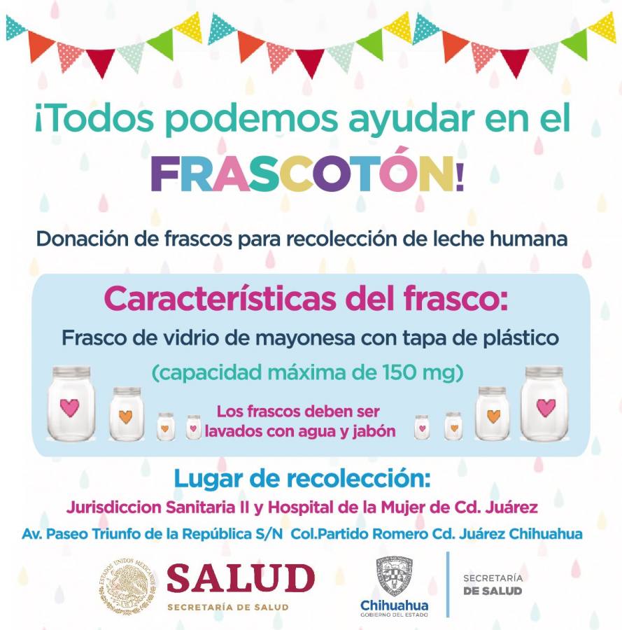 Ciudad Juárez, Chihuahua.- El Hospital de la Mujer en Ciudad Juárez y la Jurisdicción Sanitaria II solicitaron el apoyo de la ciudadanía para recolectar frascos de vidrio con tapadera plástica para almacenar leche humana. Con la colecta, llamada “Todos podemos ayudar en el Frascotón” buscan juntar la mayor cantidad de frascos de una capacidad máxima de 150 mg para recolectar la leche humana que donan las personas en periodo de lactancia al Banco de Leche Humana (BLH). Se recomienda que los frascos se lleven lavados con agua y jabón al BLH del Hospital de la Mujer, ubicado sobre la avenida Paseo Triunfo de la República en la colonia Partido Romero o en la Jurisdicción Sanitaria II que se encuentra a un costado del hospital. De acuerdo con la Secretaría de Salud del Estado, son centros especializados donde se realiza la recolección, almacenamiento y procesamiento de la leche humana. Esta leche es utilizada para los bebés que se encuentran internados en terapia intensiva y que debido a ello no pueden recibir leche materna de su madre. Las personas en periodo de lactancia que deseen donar su leche deben acudir al BLH y pasar diversos filtros de seguridad para asegurar que su leche es apta para el consumo de los bebés. La institución de salud aconsejó a las personas interesadas en informarse al respecto y estar convencidas del proceso de donación de leche humana. Finalmente informó que la “leche materna salva vidas y protege a los recién nacidos cuando son más vulnerables”.