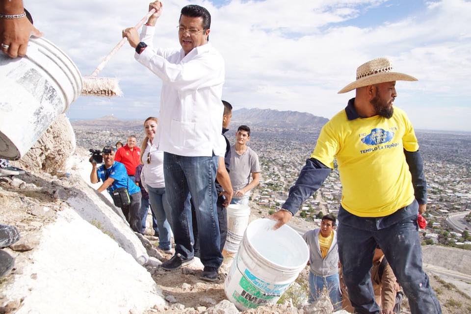El alcalde con licencia, Pérez Cuéllar, no es el primer funcionario en subir el cerro para repintar la frase. En 2018, el entonces presidente municipal Armando Cabada Alvídrez, ahora diputado federal, hizo lo mismo.