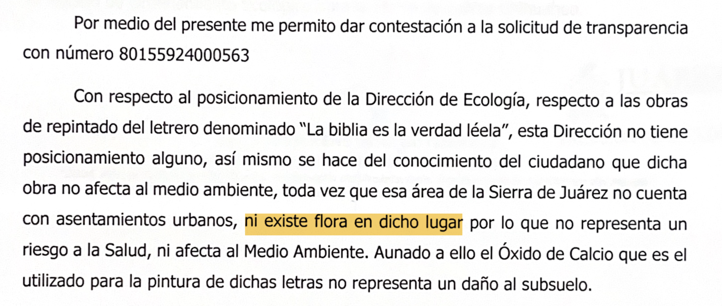 Una de las solicitudes pregunta a la Dirección de Ecología del Municipio de Juárez su postura sobre el repintado de la leyenda, a lo cual la dependencia respondió que “no tiene posicionamiento alguno (…) Dicha obra no afecta al medio ambiente, toda vez que esa área de la Sierra de Juárez no cuenta con asentamientos urbanos, ni existe flora en dicho lugar”.