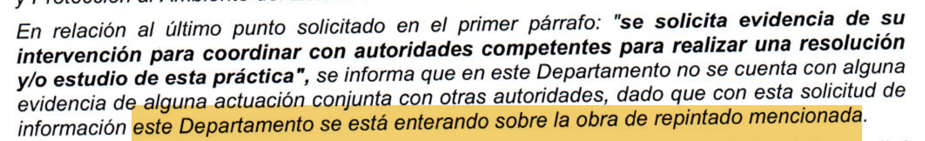Una última solicitud de información respondida por la misma secretaría reveló que nunca se ha recibido algún estudio de impacto ambiental o solicitud para realizar la pinta, por lo tanto, tampoco se ha emitido permiso alguno.
