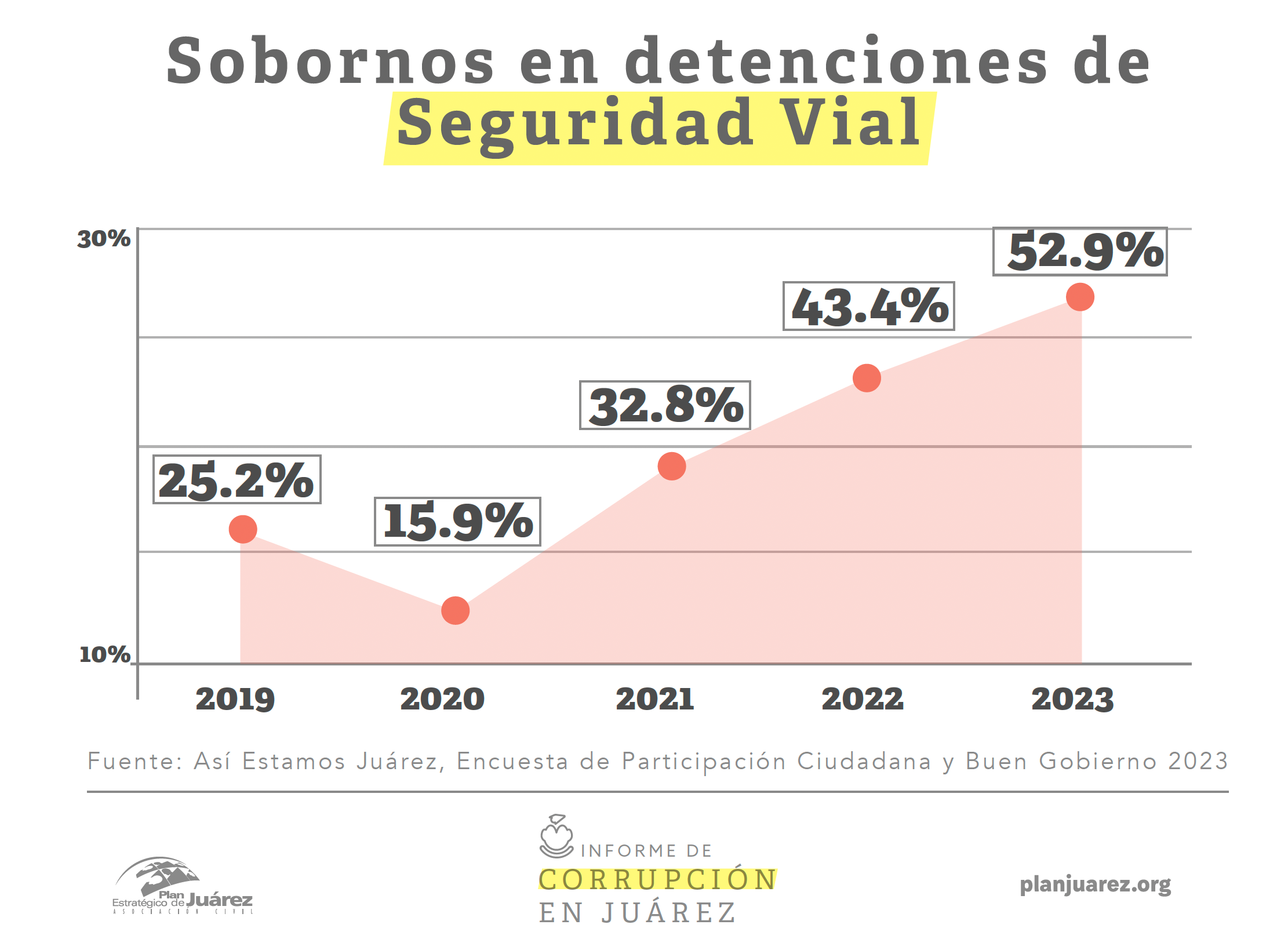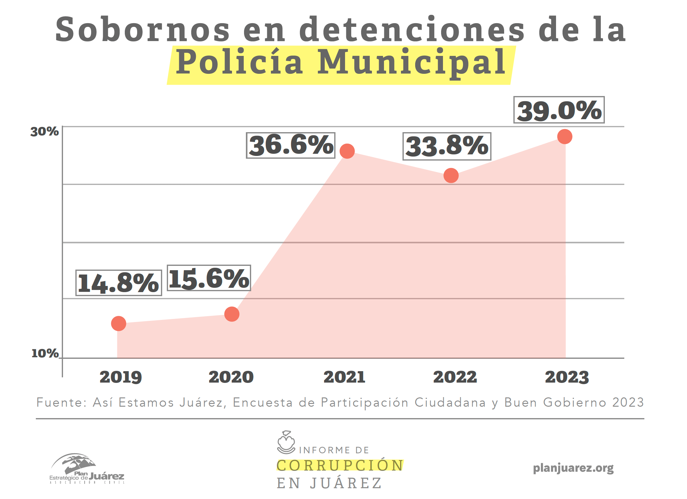 De acuerdo con el ‘Informe de Corrupción en Juárez 2024’, la ciudadanía reportó un aumento en la cantidad de detenciones y sobornos a elementos de la Policía Municipal y la Coordinación de Seguridad Vial.