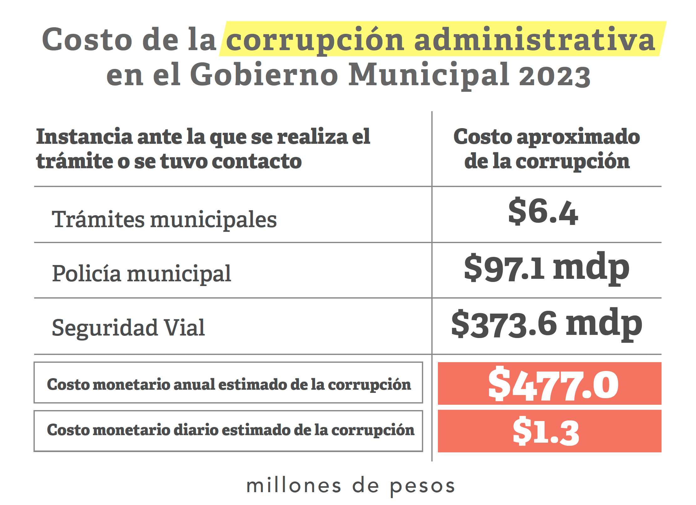 El director de PEJ, Sergio Meza de Anda, señaló que esto se traduce en un costo estimado de la corrupción administrativa de 477 millones de pesos, un aproximado de 1.3 millones de pesos diarios.