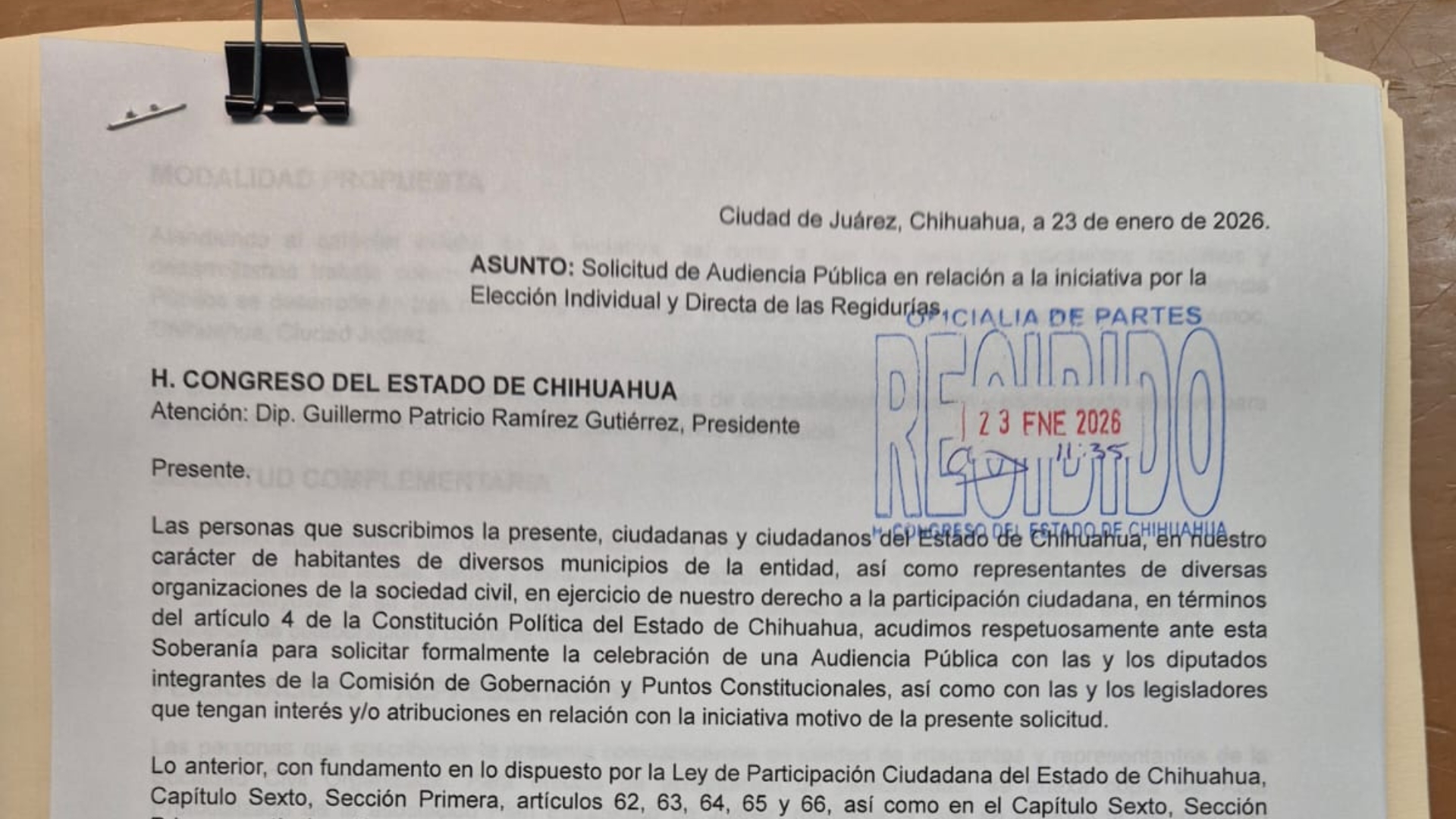 Ciudad Juárez, Chihuahua.– Organizaciones de la sociedad civil presentaron este viernes ante el Congreso del Estado de Chihuahua una solicitud de audiencia pública sobre la iniciativa legislativa para la elección directa de regidurías en el estado, la cual ha mantenido congelada por cinco años.
