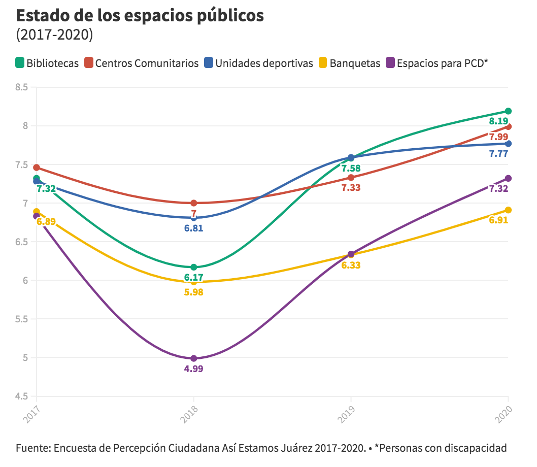 La ciudadanía que cuenta con dichos espacios también pudo calificarlos gracias a la Encuesta de Percepción Ciudadana, cuyos resultados alimentan el informe. En 2020, en general, el estado de todos los espacios fue mejor calificado por las y los juarenses que el año anterior. En 2020, las bibliotecas, pese a ser escasas en la ciudad, fueron los espacios mejor calificados, con 8.19 puntos de 10 posibles, mientras que los peor calificados fueron las banquetas, que son, a su vez, los espacios públicos disponibles para la mayoría de las personas.