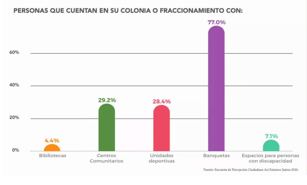 Ciudad Juárez, Chihuahua.— En Juárez hay bibliotecas en las colonias de solo 4 de cada 100 juarenses, según el Informe Así Estamos Juárez 2021, mientras que 3 de cada 10 tienen acceso a centros comunitarios y unidades deportivas. El informe destaca también que existen espacios para personas con discapacidad en la colonia de solo 7.1 por ciento de la población.
