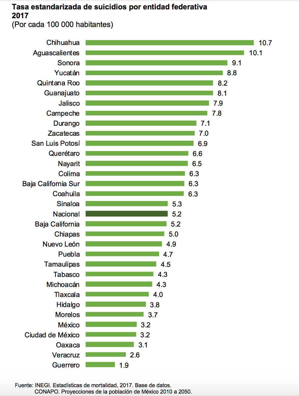 La tasa de suicidio en mujeres es de 2.6 por cada 100 mil habitantes, mientras que en hombres es de 12.3 por cada 100 mil habitantes. Las ocupaciones más recurrentes de las personas que se suicidaron en 2019 en orden son, primero, los obreros, seguidos de los jornaleros o agricultores, y después los albañiles. En el caso de las mujeres son las amas de casa, seguidas de las operadoras. De acuerdo con el reporte estadístico en torno a la cifra de suicidios del INEGI, publicado en septiembre de 2019, Chihuahua ocupa el primer lugar en cuanto a número de suicidios de las entidades federativas de México. Las entidades con mayor tasa de suicidio por cada 100 mil habitantes, fueron Chihuahua (con 10.7), Aguascalientes (10.1), Sonora (9.1) y Yucatán (8.8). La tasa de suicidios en Chihuahua por cada 100 mil habitantes representa una cifra mayor al doble de la media nacional, que es de 5.2 fallecidos por lesiones autoinfligidas. La media nacional ha crecido paulatinamente desde 2010, cuando se encontraba en 4.3.