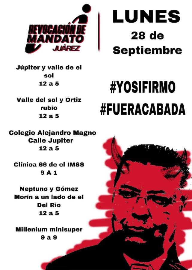 Ciudad Juárez, Chihuahua.— A poco menos de un mes de iniciada la recolección de firmas para la revocación del alcalde Armando Cabada Alvídrez, los promoventes de la iniciativa se acercan a la mitad del total necesario. De acuerdo con el Instituto Estatal Electoral (IEE), los colectivos suman 26 mil 875 firmas de las 54 mil 895 que necesitan para la realización de la jornada de votación. En caso de conseguir las firmas, se procedería a una jornada en las que las y los juarenses dirían sí o no a la pregunta: ¿Debe continuar Armando Cabada en la presidencia municipal de Juárez? Estos son los puntos en los que hoy reunirán firmas los integrantes del colectivo Revocación de Mandato JRZ: