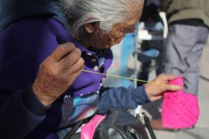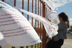 Ciudad Juárez, Chihuahua.— Corazones de todos los tamaños, de diferentes materiales, de diversos tonos de rosa. Cada uno representaba a una mujer víctima de feminicidio o de desaparición. Cada uno fue tejido, cortado, dibujado para no olvidarlas y conmemorar su vida en el marco del Día Internacional de la Eliminación de la Violencia contra la Mujer (25 de noviembre). Ayer, integrantes del colectivo Bordeamos por la Paz instalaron un ‘tapiz por la memoria’ en el Monumento a Benito Juárez con las pesquisas de mujeres que han sido víctimas de violencia de género en esta ciudad. Además, colgaron corazones con los nombres de algunas mujeres que han sido asesinadas por el solo hecho de ser mujeres. De manera simultanea, en la Ciudad de México colectivos como Restauradoras con Glitter, Paste Up Morras, Pinto mi raya, Lana Desastre, Marea Verde, Tejiendo Nuestra Identidad, realizaban la misma actividad de exigencia. Modesta Gómez, la madre de Claudia Antonia Nuñez, desaparecida en 2007, también se hizo presente en la manifestación y con la ayuda de una aguja e hijo amarillo tejió el nombre de su hija sobre un pedazo de tela en forma de corazón. Luego, a lo lejos se comenzaron a escuchar consignas feministas, cucharas rebotando en cacerolas y los pies marchando de alrededor de 15 mujeres que tomaron las calles del Centro Histórico hasta llegar al Monumento. Las integrantes de Hijas de su Maquilera Madre se unieron a la manifestación y entre ambos colectivos abrieron un espacio de diálogo en el que Modesta y José Luis Castillo, padre de Esmeralda Castillo, víctima de desaparición, expresaron estar cansados de la falta de justicia y del desinterés de las autoridades por frenar la violencia hacia las mujeres. “Ni una más, ni una más, ni una desaparecida más”, gritaban las mujeres con sus puños en alto, con sus labios pintados de verde, con fuerza en sus ojos.