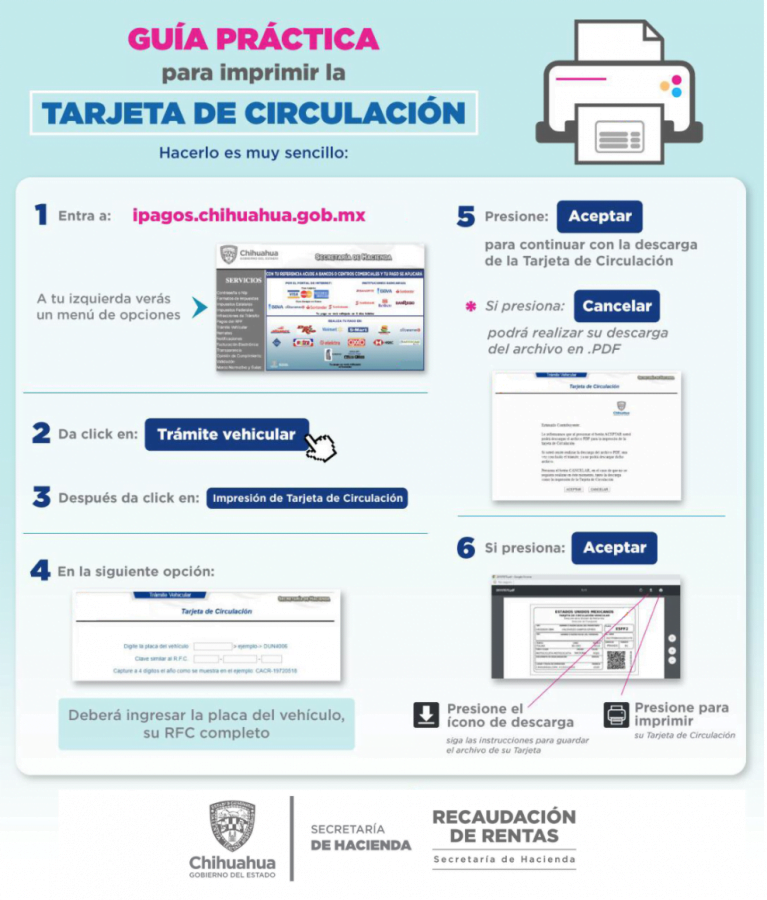 Ciudad Juárez, Chihuahua.— La Oficina de Recaudación de Rentas de Gobierno del Estado informó que la tarjeta de circulación vehicular se puede imprimir desde cualquier computadora una vez que se haya pagado el derecho vehicular 2021. Para poder imprimir el documento solo es necesario ingresar a este enlace, elegir el en el menú de la izquierda la opción “trámite vehicular” y seleccionar “impresión de tarjeta de circulación”. Es necesario ingresar la información que se solicita entre la que destaca la serie de la placa del vehículo así como el RFC completo del dueño del mismo. Después, para continuar con la descarga de la tarjeta, se debe presionar “aceptar”, y de esa manera descargar el documento e imprimir. Es importante mencionar que la Tarjeta de Circulación puede ser impresa a color o blanco y negro, siendo lo más importante que el código QR este legible.