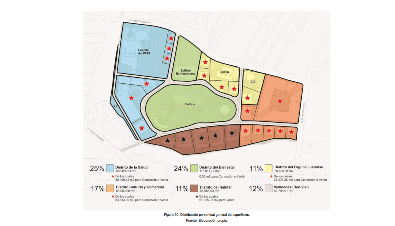 Ciudad Juárez, Chihuahua.— El Plan que se realizó para intervenir el terreno del exhipódromo en 2010, en el contexto de la estrategia Todos Somos Juárez, cambió su configuración en los aspectos más representativos del proyecto, de tal manera que de un parque urbano pasará a ser un sector comercial y de vivienda, señaló el director de la organización Juárez Limpio, Néstor Acosta Caro del Castillo. La zonficación de ambos proyectos muestra su vocación: en el Plan Maestro del 2010 se contemplaban usos urbano, deportivo, recreativo y de regeneración, mientras que en el Plan 2020 los espacios pasaron a ser público, semipúblico, privado de libre circulación y privado. Mientras la mayor parte de las 52 hectáreas contempladas en el 2010 era espacio público, de las 48 hectáreas que contempla el Plan Maestro para la Regeneración Urbano-Ambiental del Exhipódromo solo el 24 por ciento, es decir alrededor de 11 hectáreas, están consideradas como espacio público, en el llamado Distrito del Bienestar. El 64 por ciento del espacio en este proyecto es privado o público-privado y el 12 por ciento es de red vial, de acuerdo con el documento del Plan Maestro. De esta manera se determinaron cinco distritos para dividir estos espacios, edificios y actividades que se realizarán en ellos: Distrito del Bienestar. Consta de 115 mil 011.72 metros cuadrados, de los que ninguno es para venta o concesión. Como atractivo principal tendrá un parque, una plaza de acceso y el edificio del Exhipódromo. Distrito Cultural y Comercial. Está conformado por 83 mil 683 metros cuadrados, todos para concesión o venta y su atractivo principal es la edificación de un centro comercial y un hotel. Distrito del Habitar. Este consta de 51 mil 055 metros cuadrados, que se dividen en cinco lotes habitacionales en los que se construirá principalmente vivienda vertical. Todo el terreno es para venta. Distrito de la Salud. Tiene 122 mil 426 metros cuadrados de los que 50 mil se contemplan para concesión o venta. Se divide en seis lotes entre los que destaca área verde, el Hospital de Especialidades y Cancerología, y consultorios o clínicas privadas. Distrito del Orgullo Juarense. Lo conforman 50 mil 690 metros cuadrados; se divide en cinco lotes, destaca que ya se lleva a cabo la construcción del Centro de Inteligencia Artificial (CIA) y el Centro de Innovación e Integración de Tecnología Avanzada (CIITA), ambos de Gobierno del Estado. Poco más de la mitad del espacio (25 mil 438 metros cuadrados) se dispone para concesión o venta. Además, hay una red vial de 57 mil 798 metros cuadrados en la que se contempla la construcción de ciclovías y senderos para peatones.