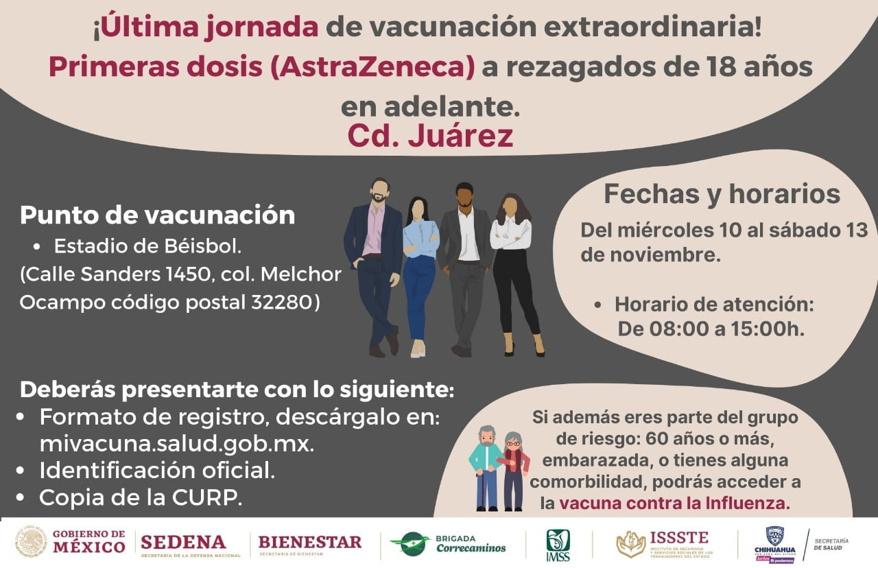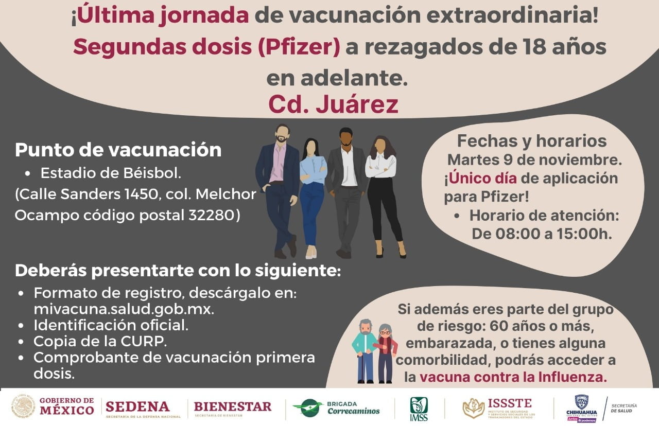 Ciudad Juárez, Chihuahua.— Esta semana será la última jornada de vacunación extraordinaria contra COVID-19 a personas rezagadas mayores de 18 años, informó la delegación de la Secretaría de Bienestar. Mañana, martes 9 de noviembre, será el único día que se aplicará la segunda dosis de la vacuna Pfizer a quienes no tuvieron la oportunidad de terminar su esquema de vacunación. Las personas que necesiten esta vacuna deberán acudir al estadio de béisbol ubicado en la calle Sanders 1450, de la colonia Melchor Ocampo, en un horario de 8:00 a 15:00 horas. Los siguientes días, desde el miércoles 10 al sábado 13 de este mes, se aplicará la primer dosis de AstraZeneca a personas rezagadas mayores de 18 años; la delegación de la Secretaría del Bienestar recalcó que esta será la última vez que se realizarán una jornada de vacunación extraordinaria de primera dosis. El horario de atención y el punto de vacunación es el mismo, de 8:00 a 15:00 horas en el estadio de béisbol. En ambos casos las personas que acudan a vacunarse deberán presentar el formato de registro que se puede descargar en el sitio Mi Vacuna. Así mismo deberán llevar su identificación oficial con fotografía y una copia de la CURP, que se puede descargar en la página de consulta del Gobierno Federal. Personas de 60 años o más, embarazadas o con alguna comorbilidad podrán acceder también a la vacuna contra la Influenza, indicó la delegación de la Secretaría del Bienestar.