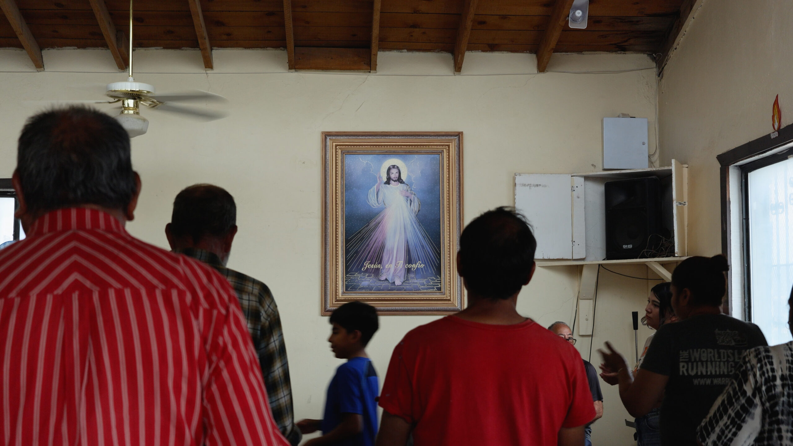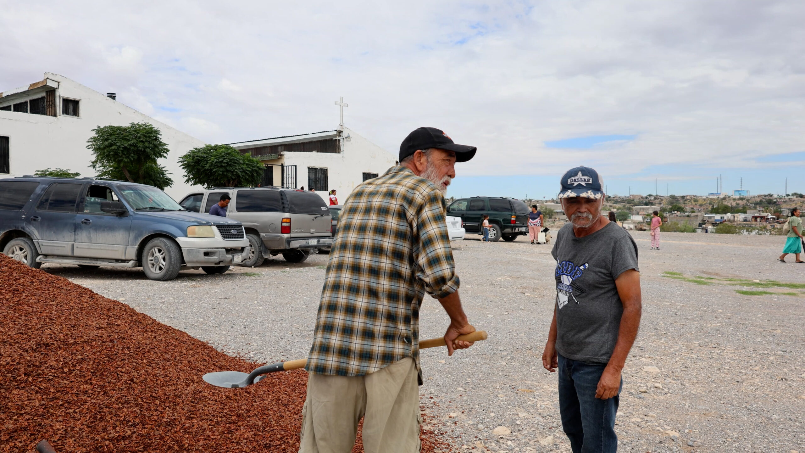 La mano de obra es totalmente voluntaria. La gente de la congregación es quien se encarga de escarbar, mover tierra, colocar grava y cáscara de nuez. Hombres de todas las edades toman una pala, un pico o una carrucha para trabajar, auxiliados por Lluvia Herrera, vinculadora comunitaria de Juárez Limpio, y Alejandro.