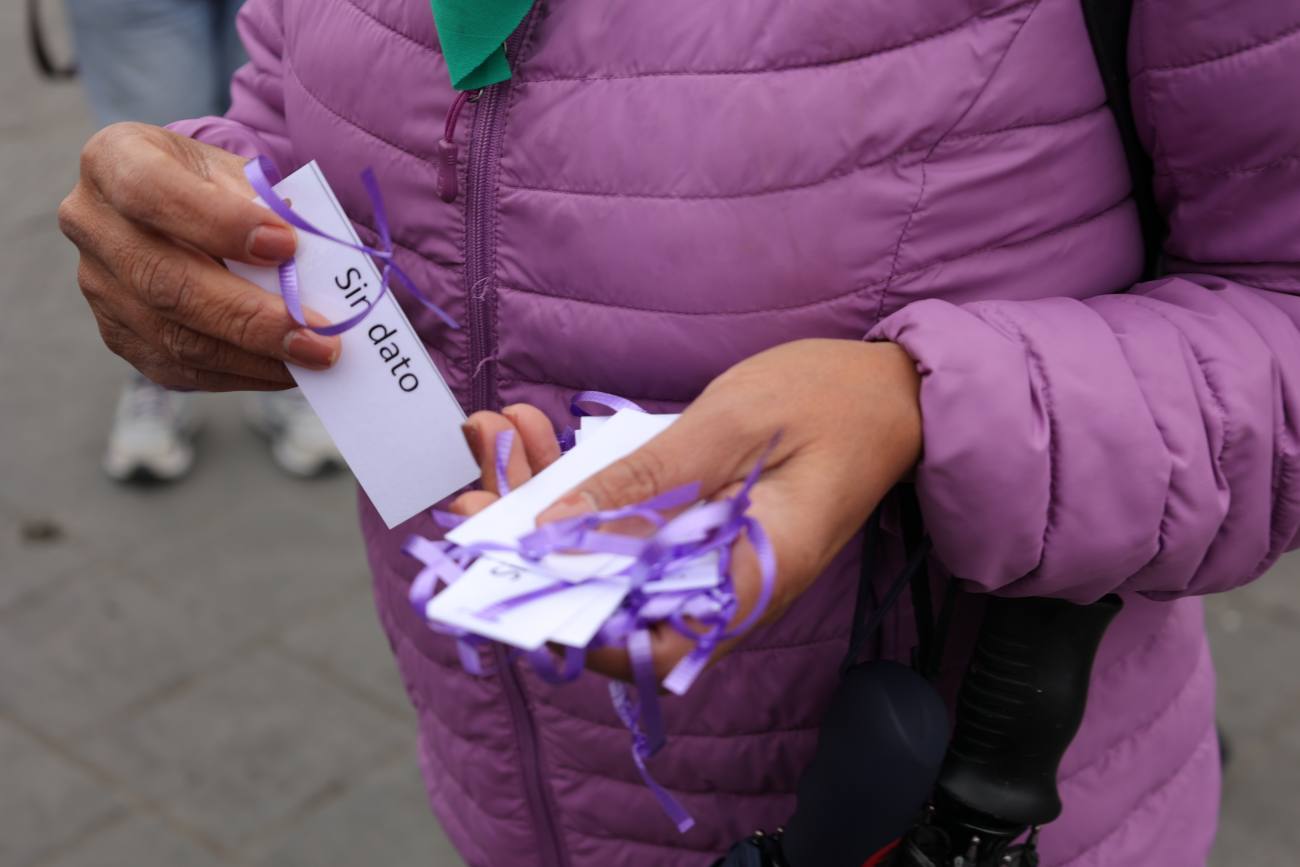 “Alzamos la voz para reiterar nuestras exigencias y anunciar que estaremos más vigilantes que nunca, para defender las políticas públicas que hemos logrado a favor de las víctimas de la violencia y a favor de la igualdad de género”, dice la activista Irma Villanueva. Norma Laguna Cabral, madre de Idaly Juache Laguna, víctima de feminicidio cuyos restos se encontraron en el Arroyo del Navajo, externa su preocupación ante los retrocesos en las políticas públicas a favor de las mujeres.  “Ya son 11 años, mi hija no está conmigo y lamentablemente ya no va a estar, pero yo aquí estoy para exigir justicia, para seguir buscando justicia para todas y para que no siga sucediendo más el asesinato de mujeres y de niñas y la desaparición”, dice. La campana resuena al término de cada participación. Las consignas feministas se gritan a todo pulmón. Los puños izquierdos se elevan ocasionalmente hacia al cielo nublado de Ciudad Juárez. Como parte de las acciones de protesta también ponen los nombres de las víctimas de feminicidio en los clavos de la cruz rosa, y tarjetas con la frase “sin dato” para recordar a las que aún no han sido identificadas.
