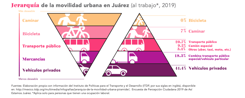 El documento presentado por la asociación civil Plan Estratégico de Juárez (PEJ) compila datos de la Encuesta de Percepción Ciudadana 2019 de Así Estamos Juárez, con los que se creó la pirámide de movilidad de las y los juarenses.