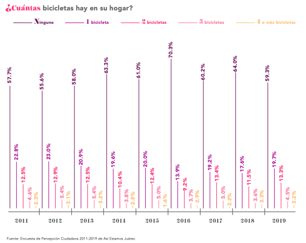 El informe de PEJ menciona que en el 2019, el 59.3 por ciento de los hogares de la ciudad no tenían ninguna bicicleta, el 19.7 por ciento contaba con una bici, el 13.3 con dos, solo el 4.5 por ciento anunció tener tres y el 3.2 cuatro o más bicicletas.