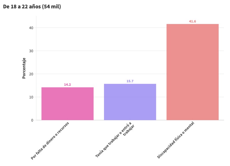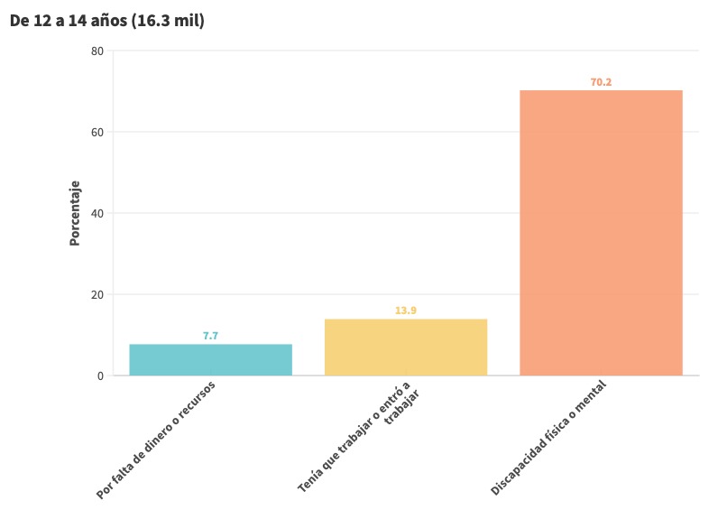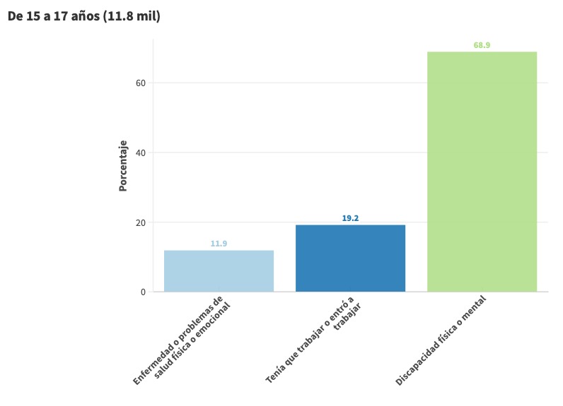 Los motivos principales varían de acuerdo con los grupos de edad, pero en la población de 12 a 29 años las razones que más predominan son discapacidad física y mental; tenían que trabajar o entró a trabajar; por falta de dinero o recursos; y por último, por enfermedad o problemas de salud física o emocional (afecciones cardíacas, cáncer, depresión o ansiedad).