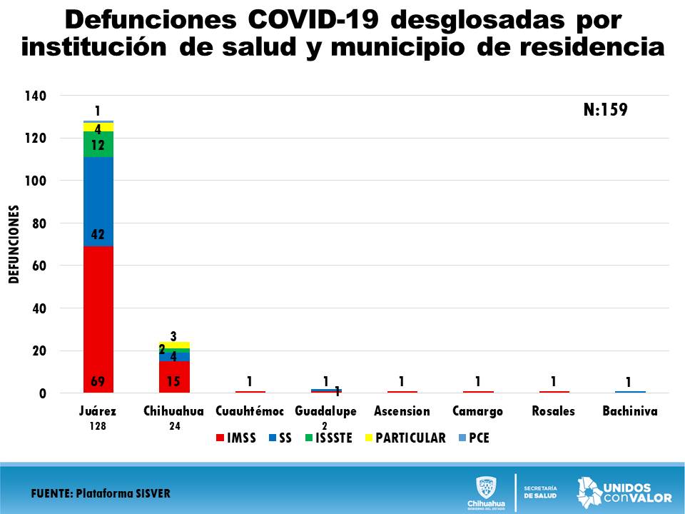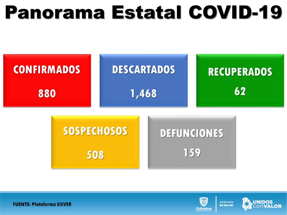 Ciudad Juárez, Chihuahua.— La secretaría de Salud de Gobierno del Estado informó que en Chihuahua tienen confirmados hasta el momento 880 casos positivos por COVID-19 y 159 muertes derivadas de la misma enfermedad, informó el director médico Zona Norte, Arturo Valenzuela. De los casos que han sido confirmados a través de pruebas PCR, 553 pertenecen a Ciudad Juárez, mientras que el número de fallecidos en este municipio es de 128, de acuerdo con el médico Arturo Valenzuela.