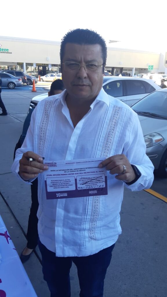 Ciudad Juárez, Chihuahua.— El alcalde Armando Cabada Alvídrez votó hoy a favor de la construcción del nuevo aeropuerto en Texcoco, en la consulta pública convocada por el presidente electo Andrés Manuel López Obrador. El senador de Morena Carlos Loera de la Rosa acudió hoy a la Unidad Administrativa Benito Juárez para sostener una reunión con el alcalde Cabada. En la reunión el senador invitó al alcalde a participar de la consulta pública que se lanzó a nivel nacional. Las opciones para votar son por la continuación del aeropuerto en Texcoco o la ampliación y construcción de más infraestructura de los que ya existen en la Ciudad de México y en Toluca, e instalar dos pistar en la base área de Santa Lucía.